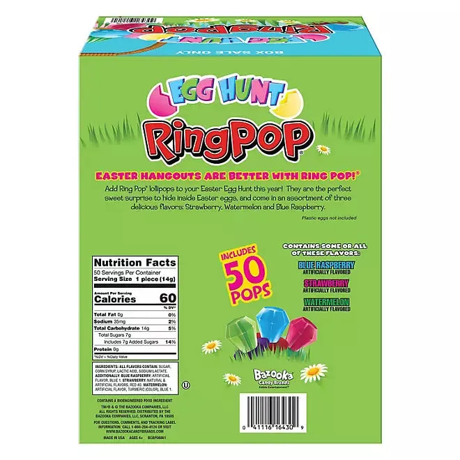 The Ring Pop Egg Hunt Candy Variety Pack (50 Count) is the ultimate Easter treat, available at Candy Warehouse! This festive Easter Ring Pop box features 50 individually wrapped Ring Pops in three delicious flavors: strawberry, blue raspberry, and watermelon. Perfect for Easter egg hunts, party favors, baskets, and sharing, these colorful, oversized candy rings have been a kid-favorite for over 40 years. Whether you're looking to add some fun to your Easter celebrations or stock up on a nostalgic treat, grab your Ring Pop Egg Hunt Variety Pack today from Candy Warehouse and let the sweet, wearable fun begin!