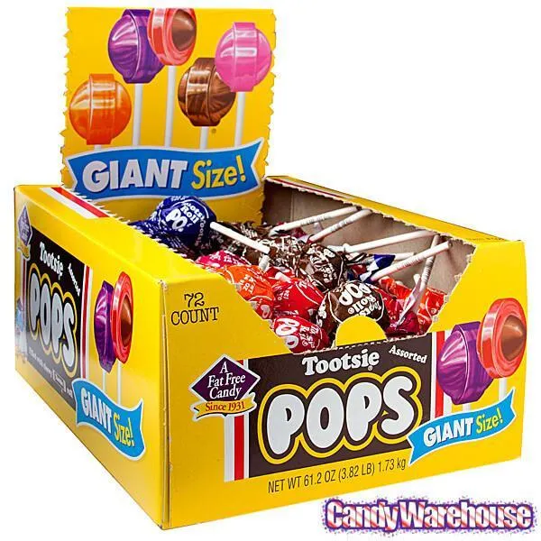 A larger version of the classic candy filled lollipops, these delicious Tootsie Pops feature an assortment of five fabulous flavors:CherryChocolateGrapeOrangeRaspberryBox contains 72 Giant Tootsie Pops.Made in the USA.Shipping Weight ~ 5 lbs.