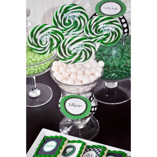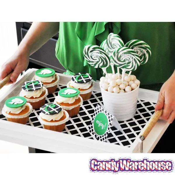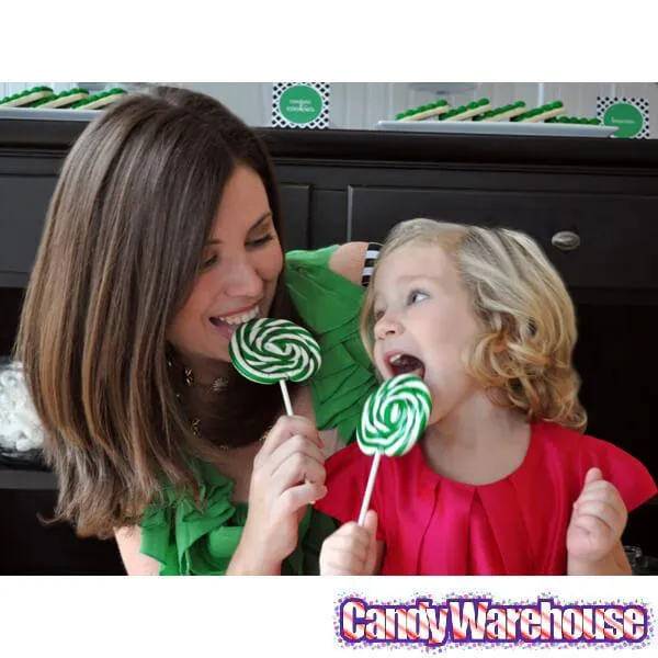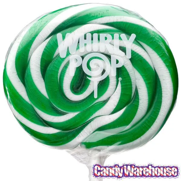 Display box contains 24 wrapped Green & White Swirl Whirly Pops, each with a net weight of 1.5 ounces. The sturdy, longer-than-average sticks of these pops help you to enjoy them without accidentally licking the knuckles and fingers of your hand that holds the stick.