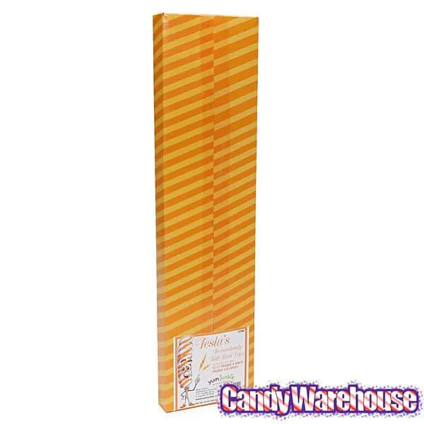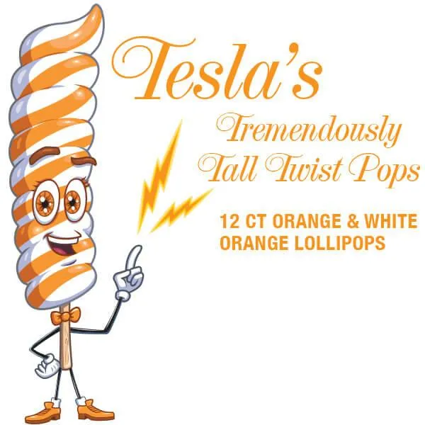 Box contains 12 wrapped Orange & White Tesla's Tremendously Tall Twist Pops.