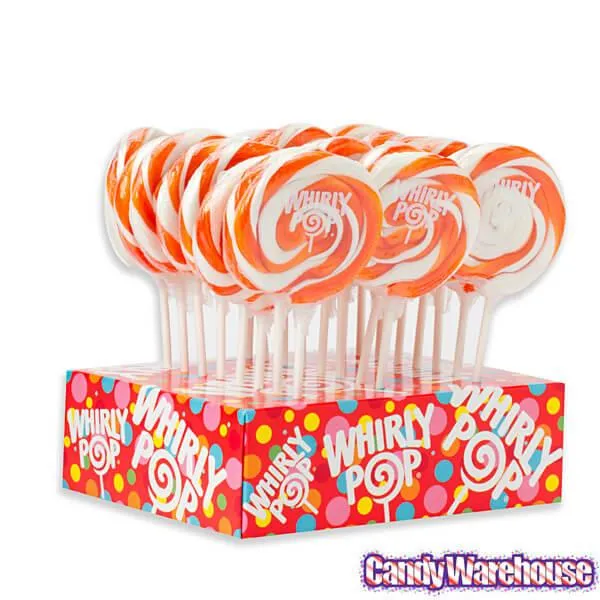 Box contains 24 wrapped Orange & White Swirl Whirly Pops, each with a net weight of 1.5 ounces. The sturdy, longer-than-average sticks of these pops help you to enjoy them without accidentally licking the knuckles and fingers of your hand that holds the stick.