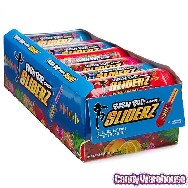 Hip and slick, these cool candy packs have easy eating instructions: Slide, Flip and Lick! Assortment includes three delicious flavors:Berry Twisted, Warped Watermelon, and Fruit Frenzy.Display box contains 18 Push Pop Sliderz Candy Dispensers.Shipping Weight ~ 3 lbs.