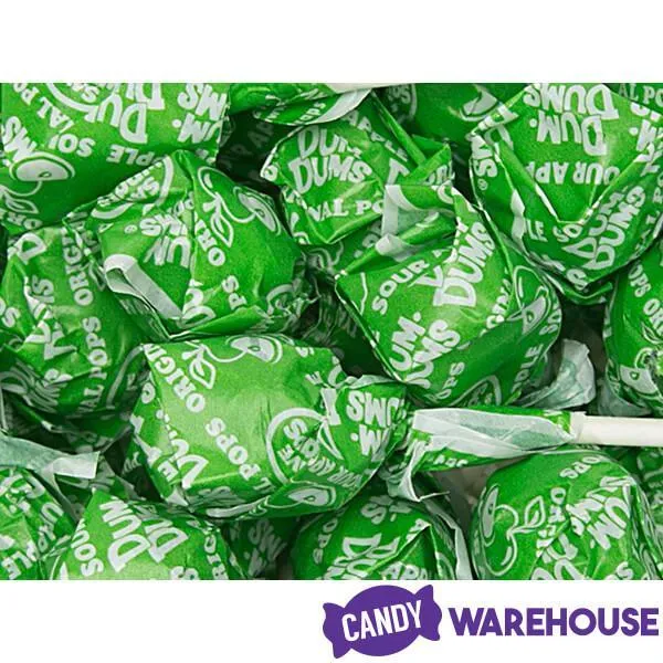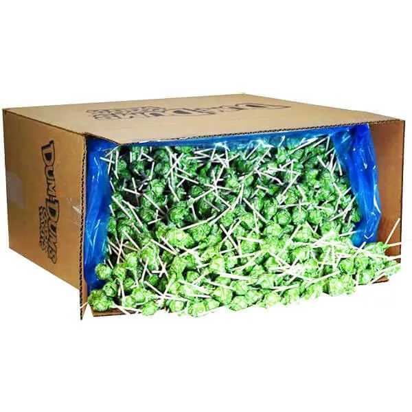 Bag contains 5 pounds of Sour Apple Dum Dums Green Party Pops.