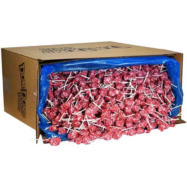 Bag contains 5 pounds of Strawberry Dum Dums Red Party Pops.
