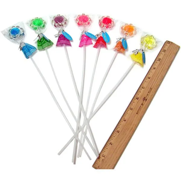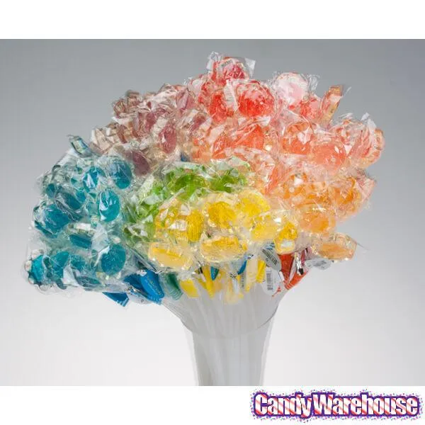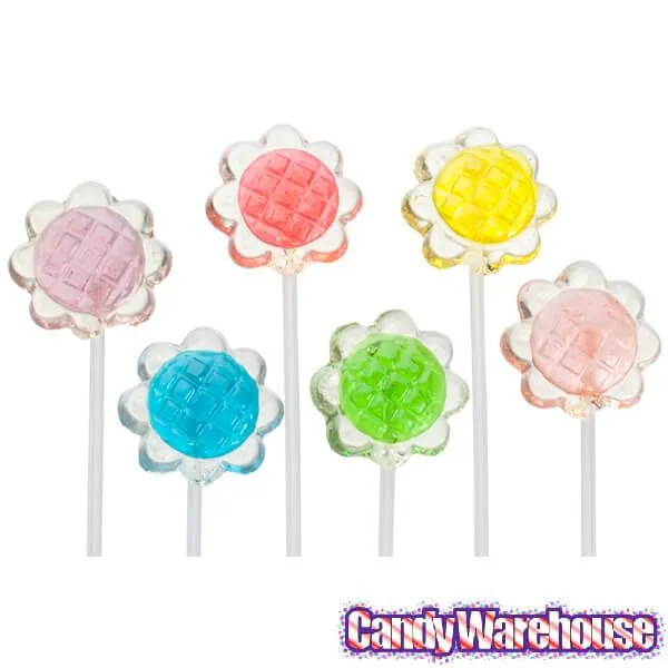 Here comes the sun . . . and the sunflowers! You can bundle a bouquet of beautiful sunflowers with a pretty bow – and then eat them. These cute lollipops are shaped like miniature sunflowers and placed on long, flexible sticks. They’re brightly colored, refreshing, and yummy! Use them as decorations, gifts, and favors at parties and events. The total length of these lollipops is about 12 inches and each sunflower is individually wrapped with cellophane. Assortment includes 7 translucent colors and fruit flavors: