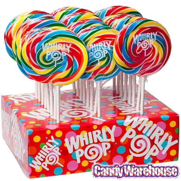 Case contains (2) 24 wrapped Rainbow Swirled Whirly Pops Displays. That's a total of 48 lollipops!