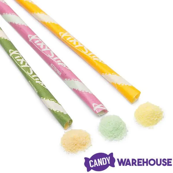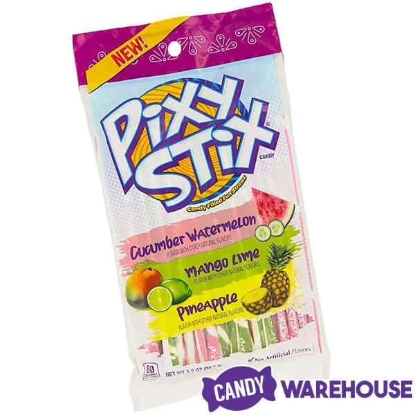 Box contains 12 Cucumber Watermelon, Mango Lime, and Pineapple Dulceria Pixy Stix Bags, each with a net weight of 3.2 ounces.