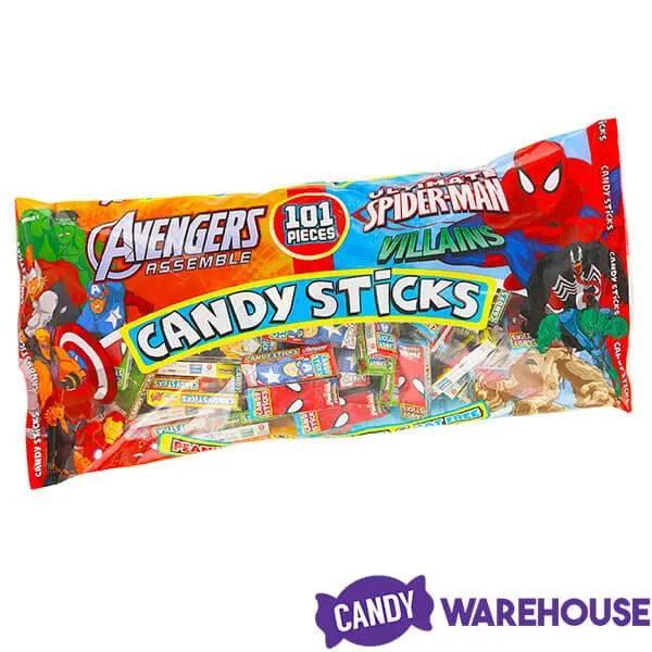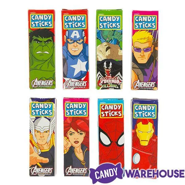 Classic white candy sticks are packed in fun Marvel cartoon character packs featuring all of your favorite superheroes, including: Spider-Man Thor Hulk Iron Man Captain America