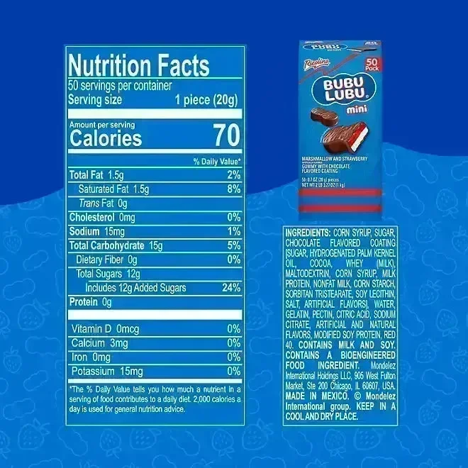 Package contains 50 Ricolino Bubu Lubu Mini Candy Bars, each with a net weight of 0.7 ounce.