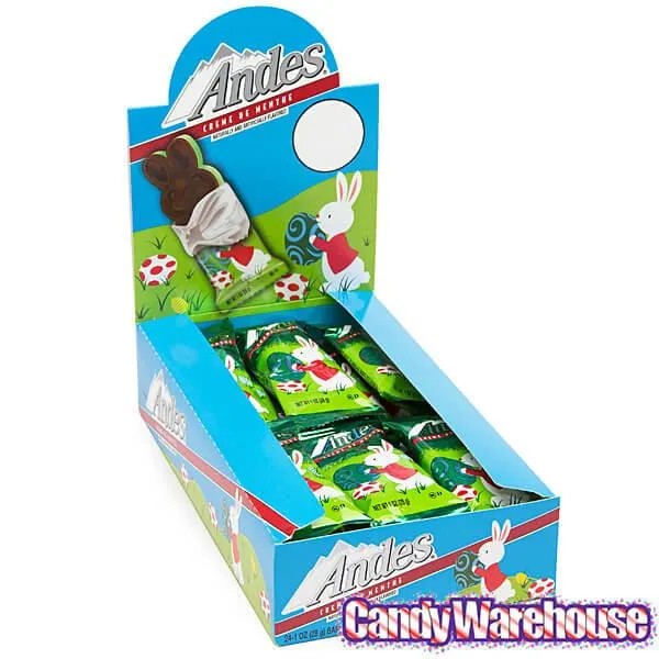 Display box contains 24 Andes Creme de Mentha Easter Bunny Candy Packs.