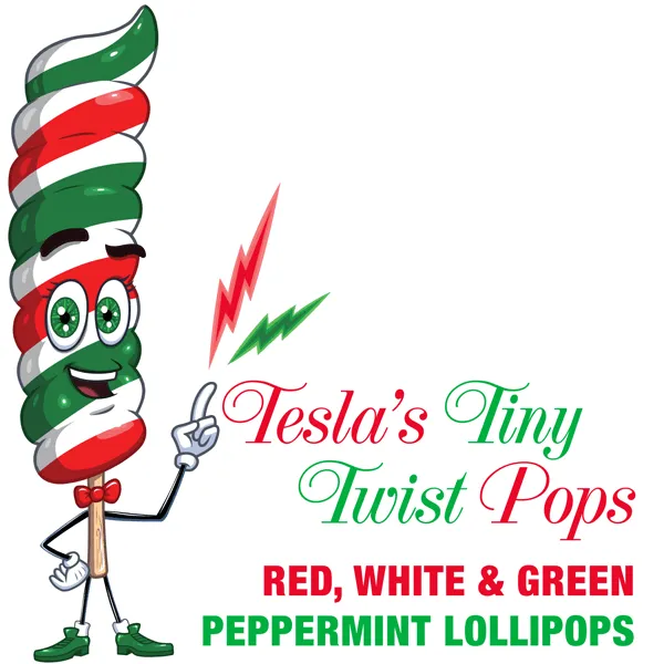 Tiny lollipop spirals of red, green, and white hard candy featuring a refreshing peppermint flavor! Inspired by mad scientist Nikola Tesla’s induction coil, these minute marvels are engineered to transmit fabulous flavors with every twist and turn. Shockingly scrumptious, you won’t be able to resist the magnetic pull of their sweetness. Santa Claus himself will marvel at the delicious little lollipops that deliver a powerful peppermint punch. More fun than traditional candy canes, these festive mint pops are sure to surprise and delight with every bite!