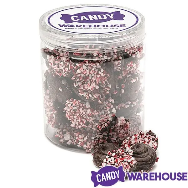 Jar contains 1 pound of Dark Chocolate Peppermint Nonpareils Candy.