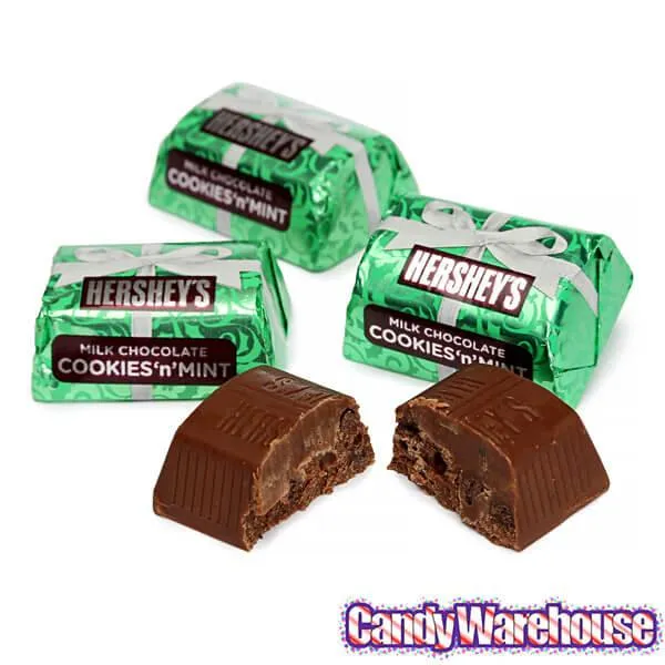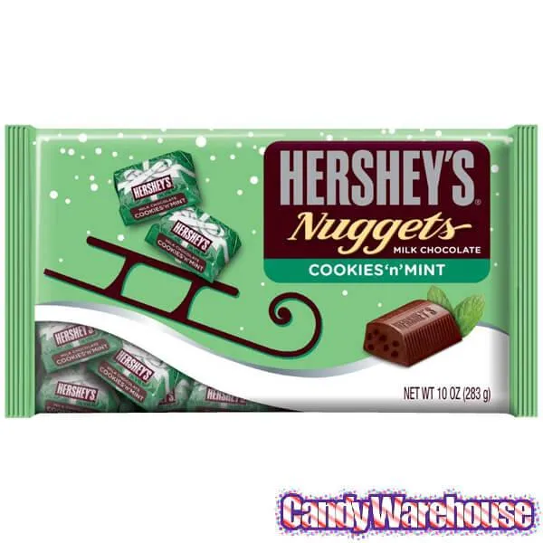 Bag contains 10 ounces of Hershey's Milk Chocolate Cookies n Mint Nuggets Candy.
