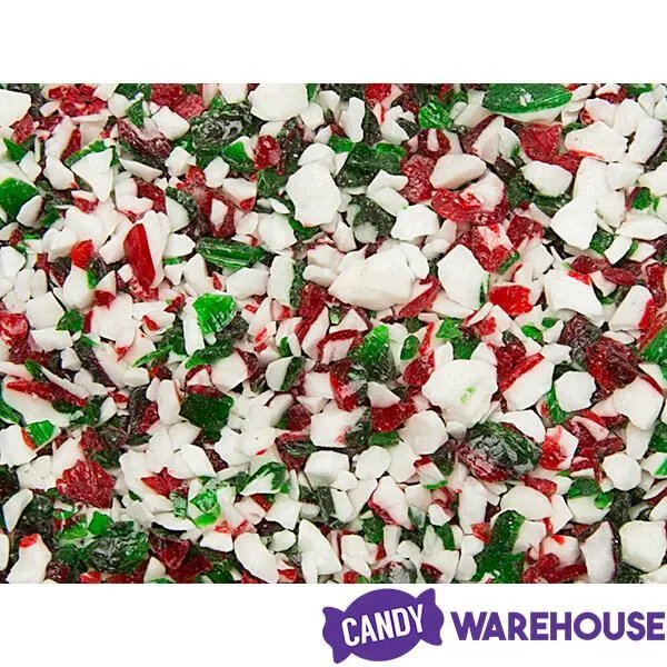 Jar contains 1 pound of King Leo Crushed Peppermint Candy Bits in Red, Green, and White.
