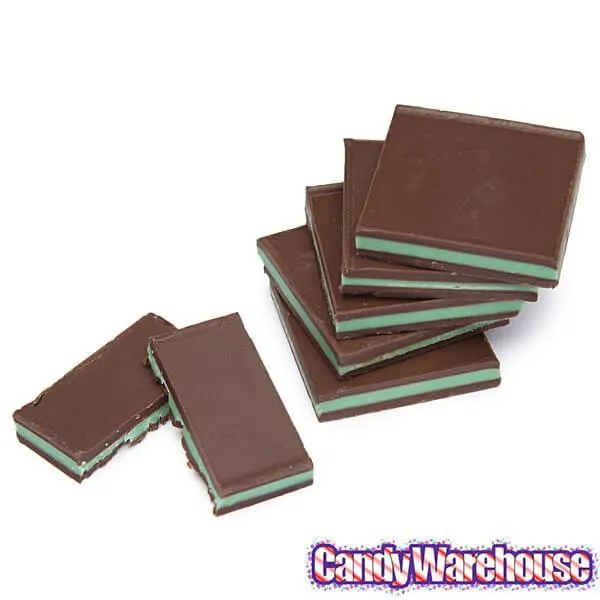 Scrumptious chocolate mint wafer squares! A yummy green mint center, flavored with pure peppermint oil, is sandwiched between two layers of rich dark chocolate. Each chocolate is wrapped in lucky green foil.