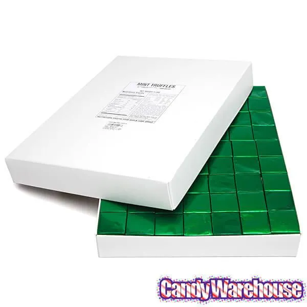Box contains 5 pounds of Green Foil Wrapped Dark Chocolate Mint Squares Candy.