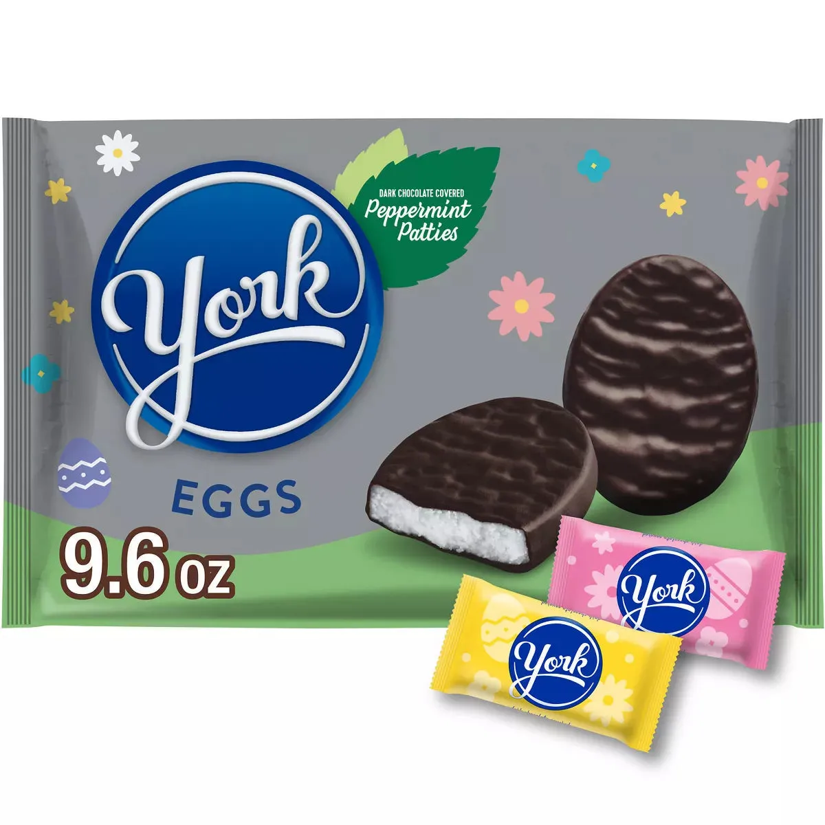 Classic dark chocolate covered York Easter candy peppermint patties featured in a new egg shape with shiny metallic wrappers of yellow, pink, and pastel blue!