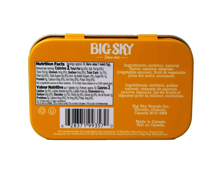 The Big Sky Mints - Orange & Crème (Sugar-Free) deliver a smooth and refreshing citrus-vanilla blend, available at Candy Warehouse! These sugar-free mints capture the creamy, dreamy taste of orange and crème, offering a burst of instant freshness with every piece. Made with no artificial colors, they provide a pure and natural flavor experience, perfect for those who love a sweet yet refreshing treat. Ideal for on-the-go freshness, sharing, or satisfying your citrus cravings, grab your Big Sky Orange & Crème Sugar-Free Mints today from Candy Warehouse and enjoy a delightful twist on classic mints!