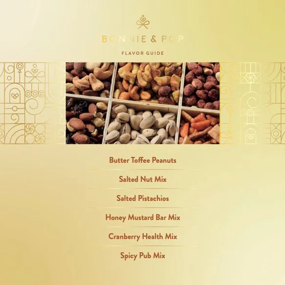 Salted Pistachios, Cranberry Health Mix, Butter Toffee Peanuts, Spicy Pub Mix, Honey Mustard Mix, Salted Mixed Nuts