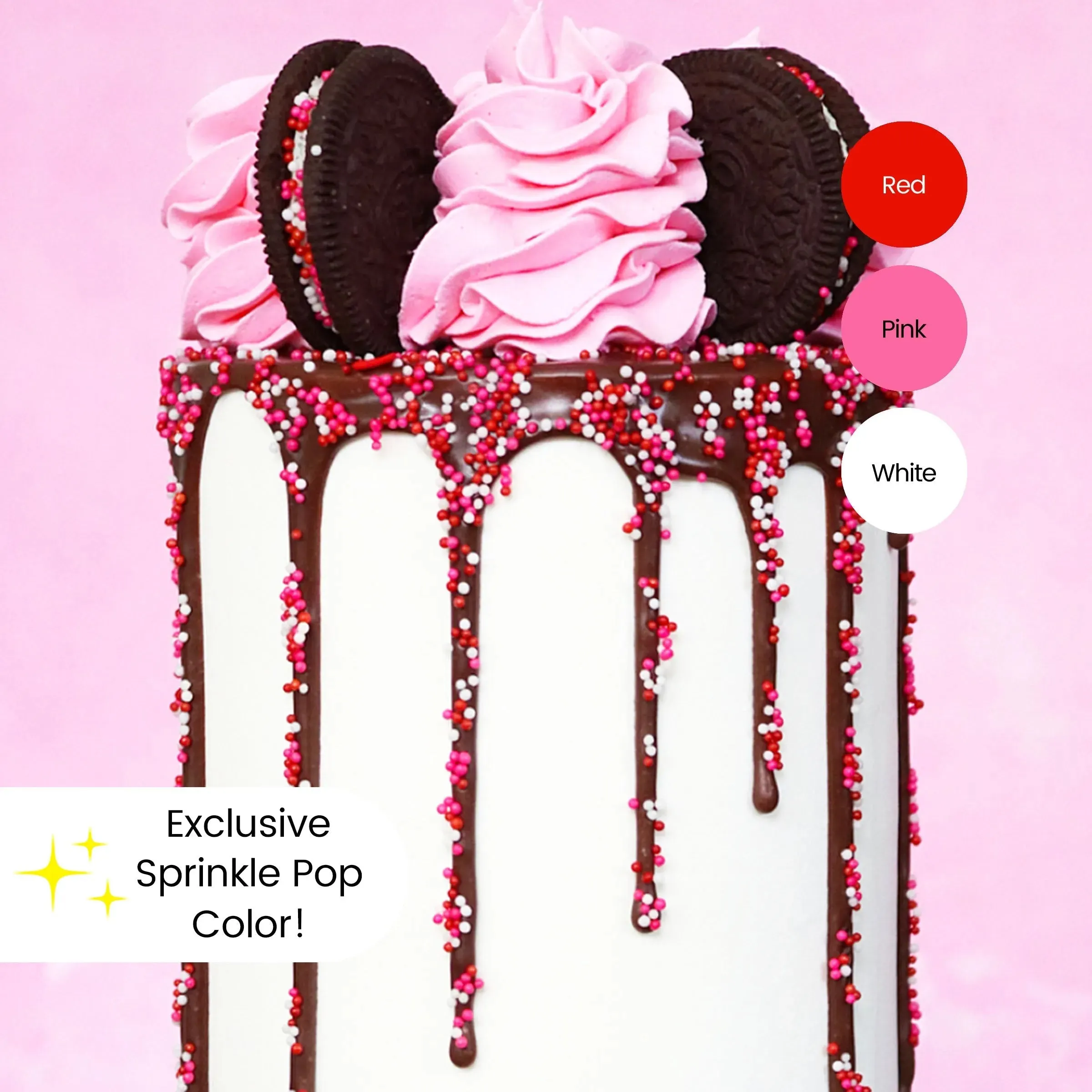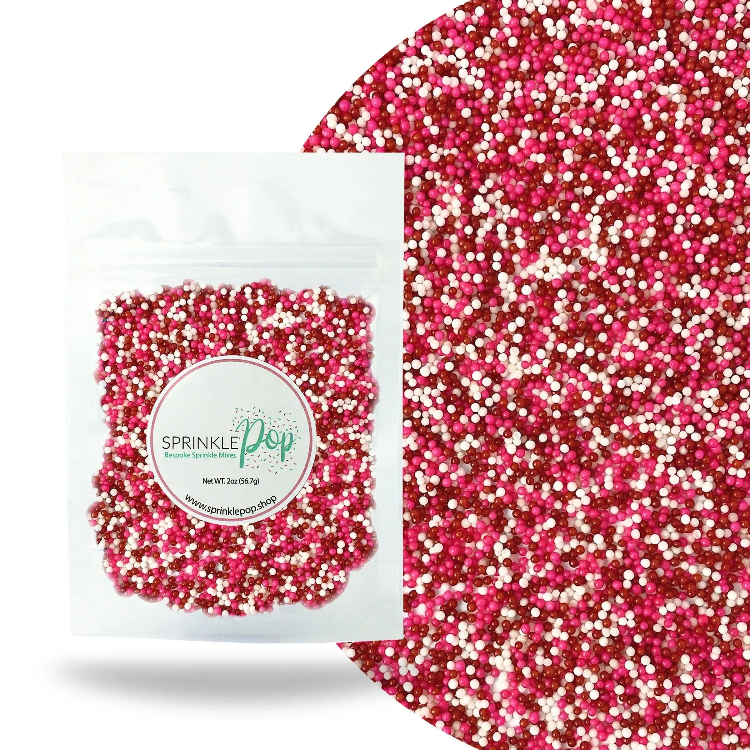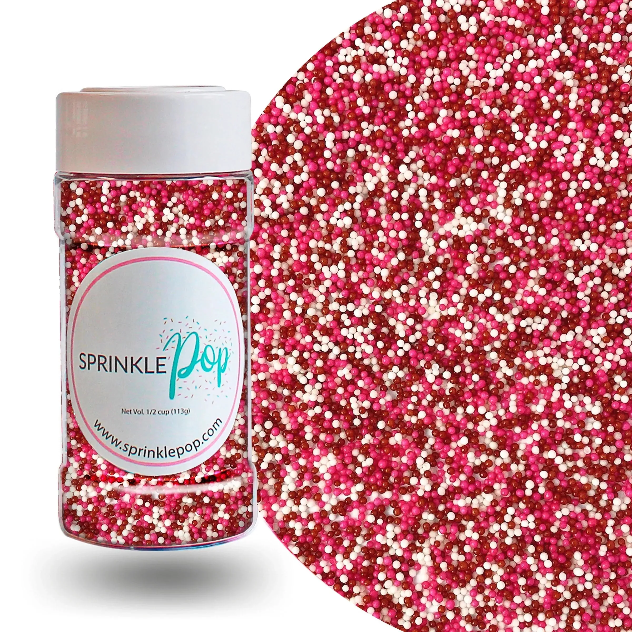 Red, pink, and white nonpareil sprinkles.
