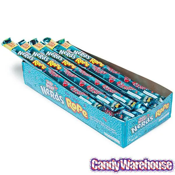 It's two sweet treats in one! Each gummy licorice rope is covered with tiny, crunchy, berry flavored Nerds candy.Rope Length: 12 InchesDisplay box contains 24 packs of Very Berry Nerds Rope Candy.Made in the USA.Shipping Weight ~ 3 lbs.