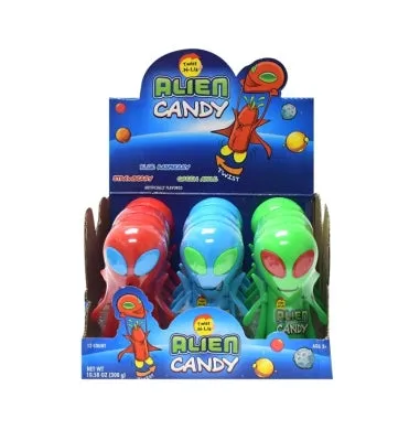 Display contains 12 Alien Twist-N-Lik Candy Pops, each with a net weight of .88 ounce.