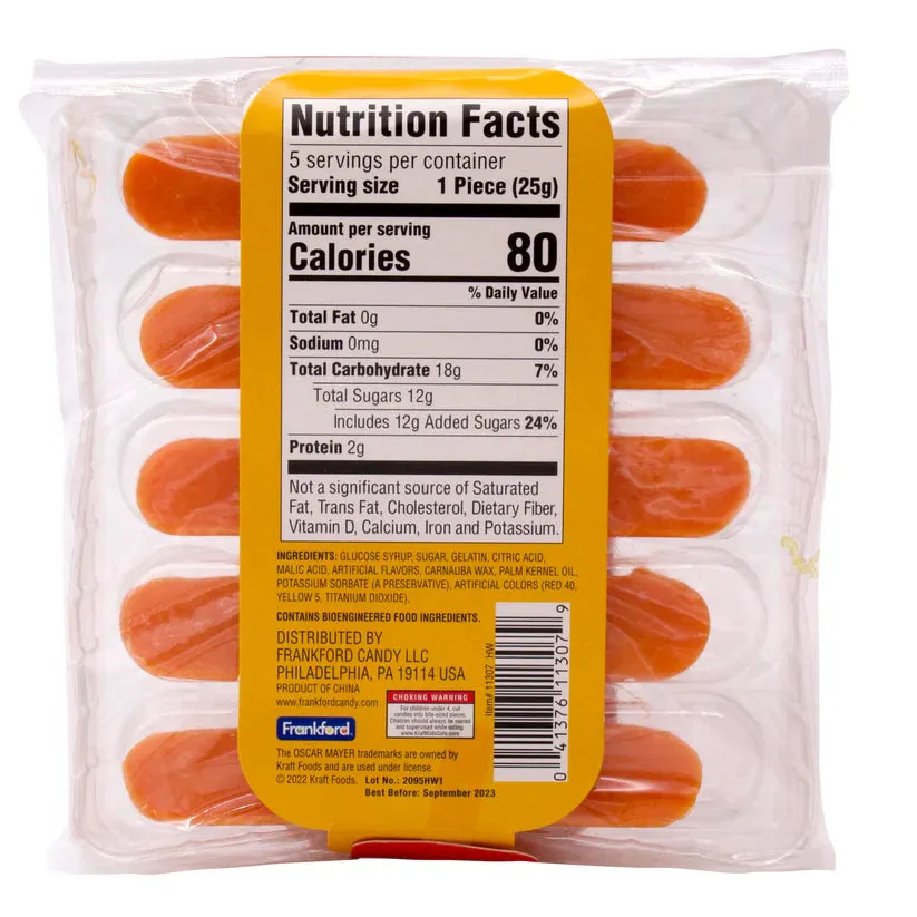 The Kraft Oscar Mayer Gummy Hot Dogs are a fun and fruity twist on a classic cookout favorite, available at Candy Warehouse! No grill required—these soft, chewy gummy hot dogs deliver a delicious burst of fruity flavor in a playful hot dog shape. Perfect for snacking, sharing, or gifting, this novelty treat is sure to bring smiles to candy lovers and foodies alike. Whether you're looking for a unique snack or a fun party favor, grab your Oscar Mayer Gummy Hot Dogs today from Candy Warehouse and enjoy a sweet spin on a summertime classic!