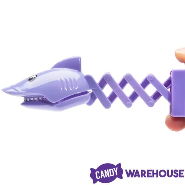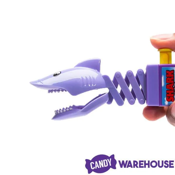 Released to the big screen in 1975, the feature film Jaws about a killer Great White Shark was a surprise sensation that still terrorizes the thoughts of beach-goers everywhere. The graphics featured on these unique accordion arm shark pops feature an image similar to the Jaws movie poster... the sea monster about to breach the still waters below an unsuspecting swimmer and a shark munching a surf board. Bring the candy to life by pressing a button on the pop and watch as the shark head extends and the mouth clamps down upon its prey. A great party favor for beach parties or other summer events, Shark Bite suckers are sure to enliven the festivities.