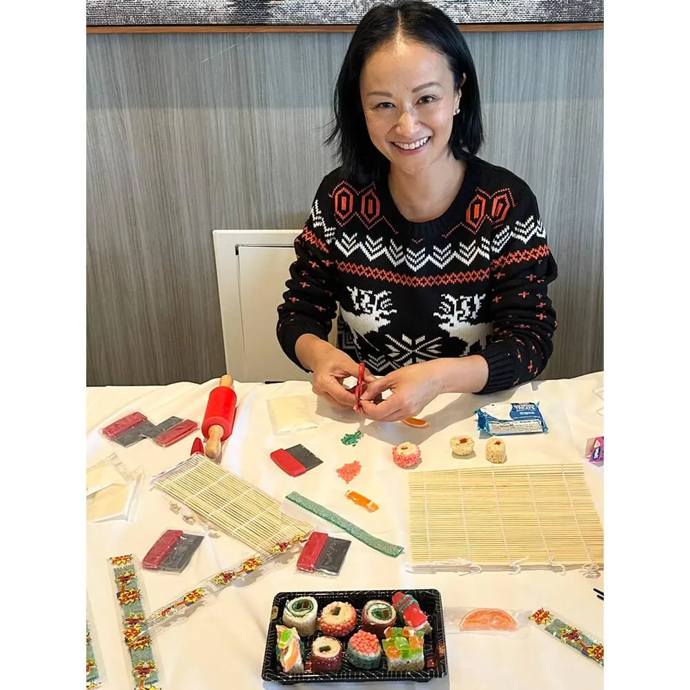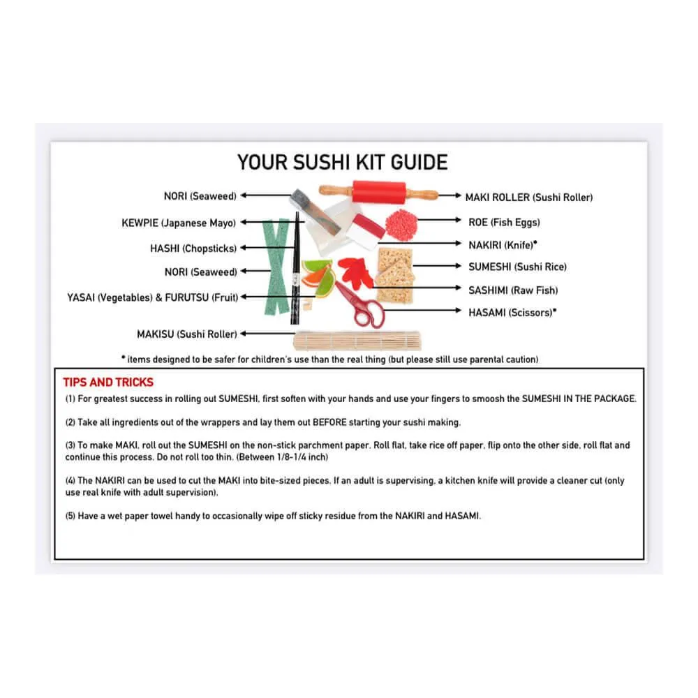 Kit materials include: 1 icing packet, 1 mini sushi rolling mat, 1 mini rolling pin, 2 wax papers, 1 chopstick holder, 1 set of chopsticks, 1 pair of scissors, 1 mini pastry cutter, and 1 plastic sushi box(lid included).