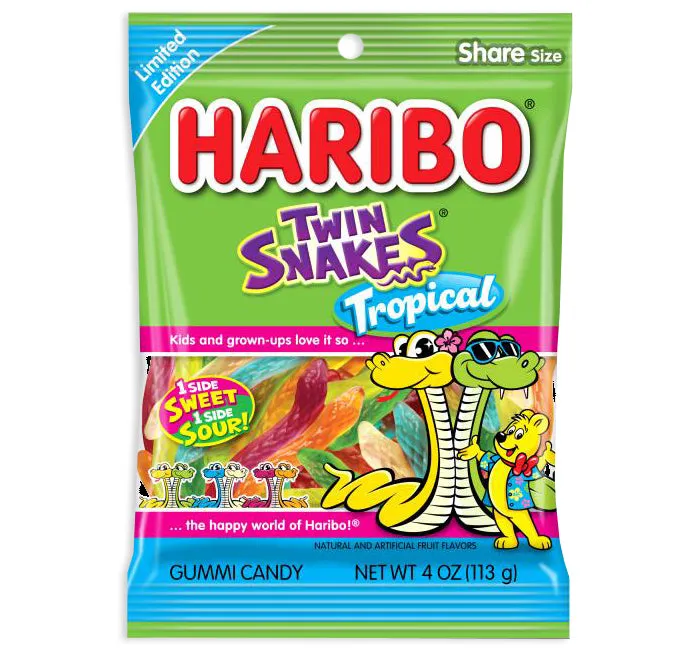 Haribo Gummy Tropical Twin Snakes Candy Peg Bags: 12-Piece Box