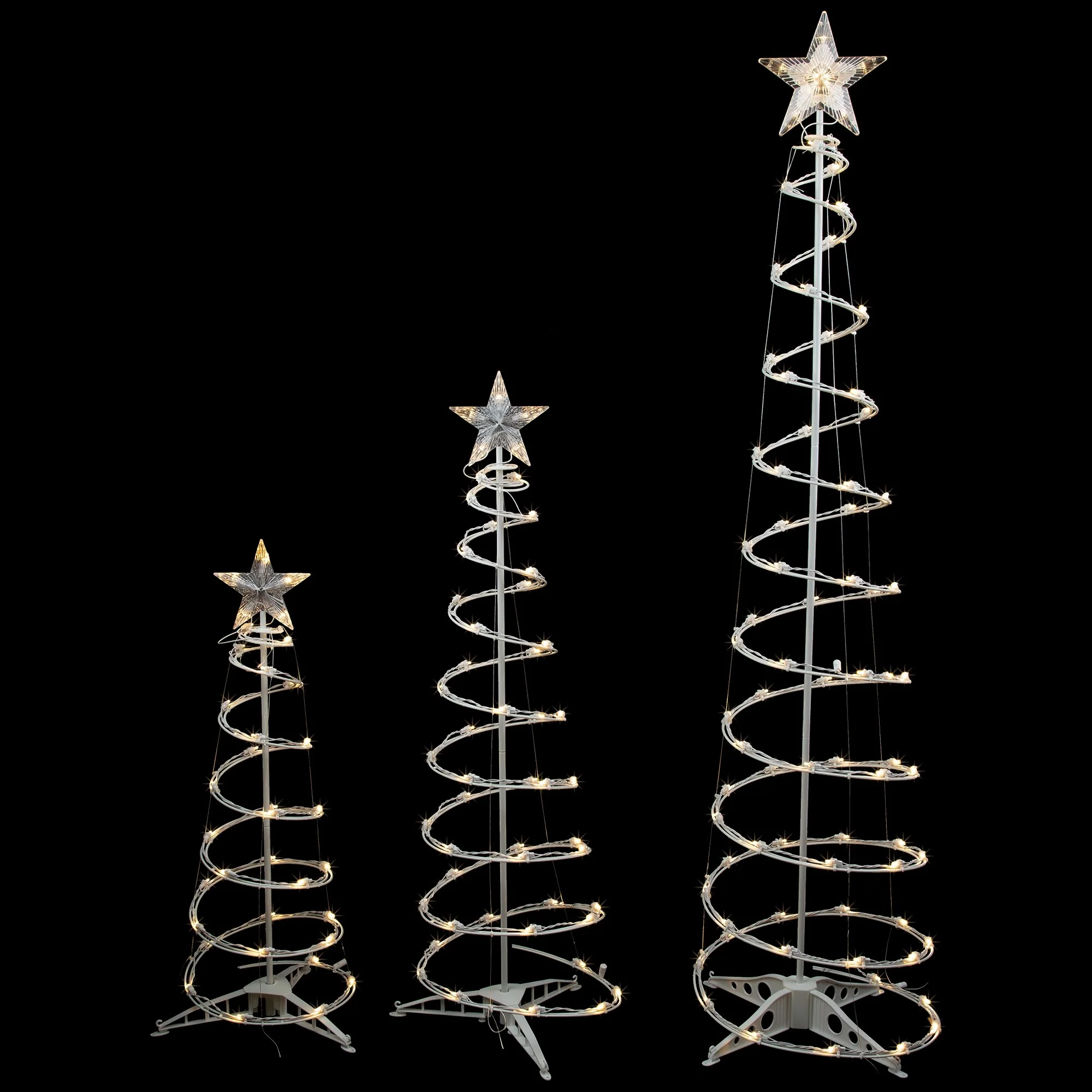 Create your own wonderland by effortlessly adding a soft, warm glow with our spiral-shaped Christmas trees, a classic for holiday lawn decorating. This set comes fitted with warm white LED lights, that are UL listed for both indoor and outdoor use. Perfect for any area of your home or yard that needs a special holiday touch. The easy assembly allows for a quick and effortless setup, and the included lawn stakes allow you to secure the trees into the ground.