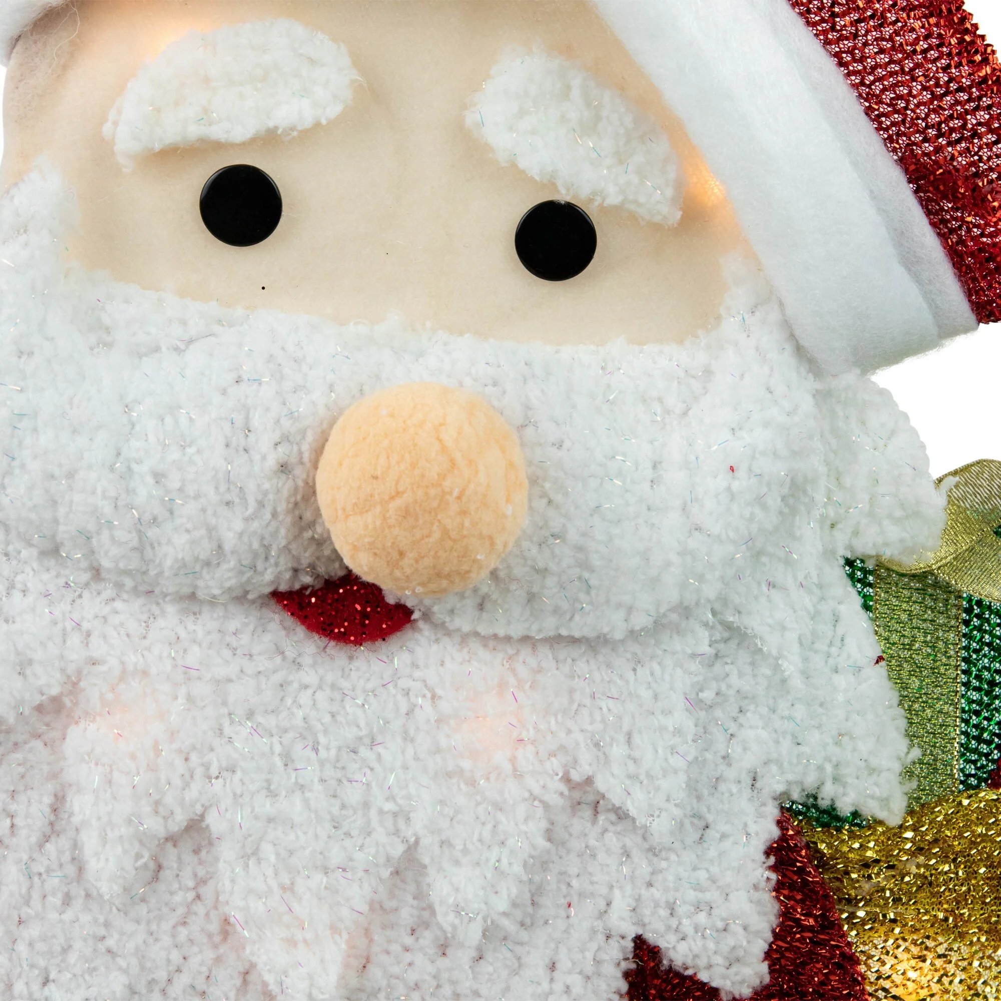 Lighted Santa has a sparkling tinsel body