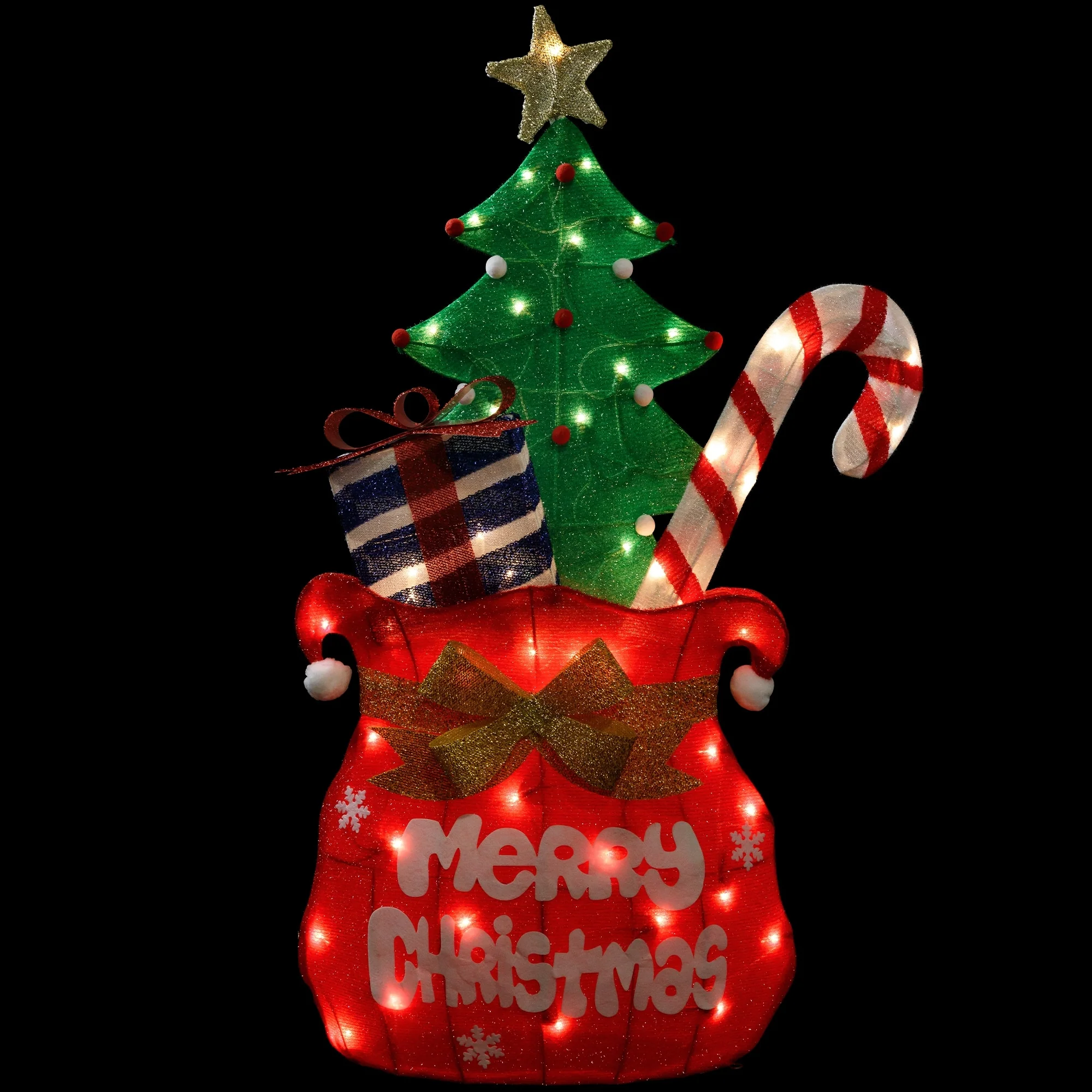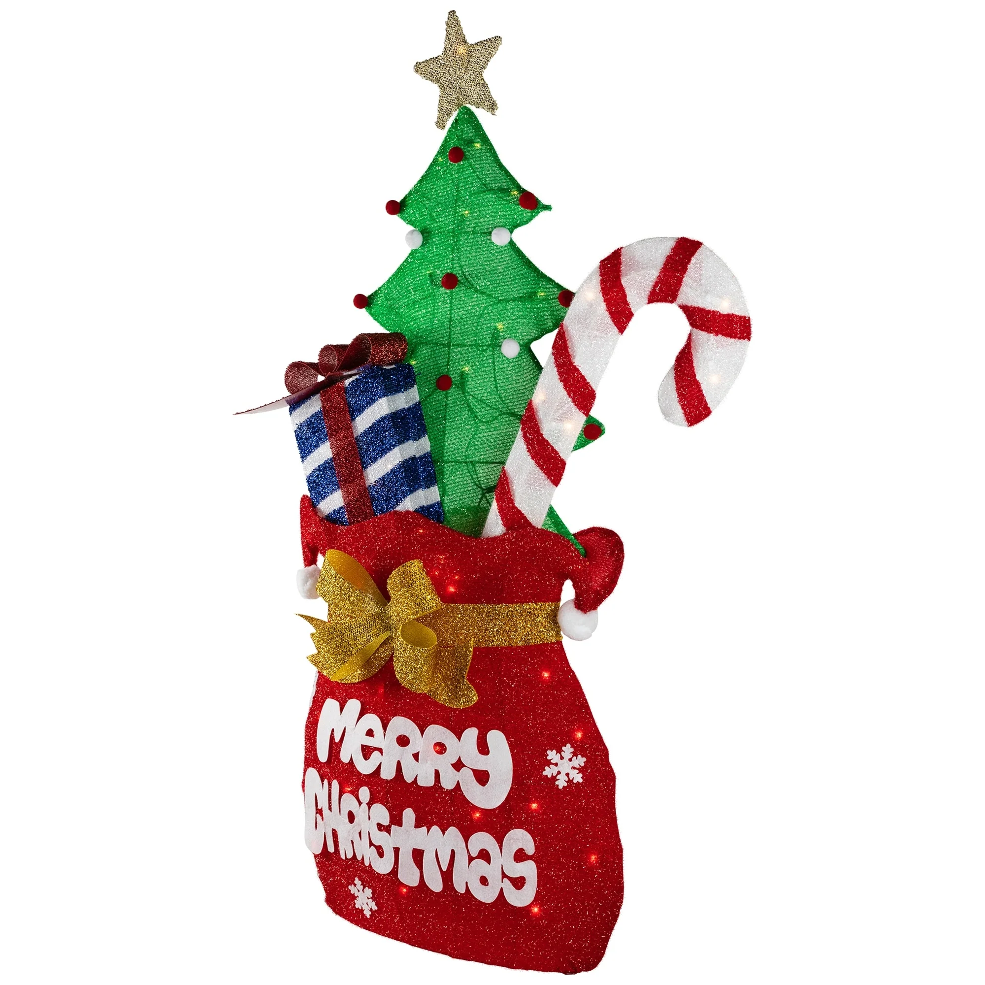 Get into the holiday spirit with this lighted gift bag yard decoration. This fabric gift bag is red reads "Merry Christmas" and is accented with a gold bow. Stuffed with a decorated Christmas tree a striped candy cane and a gift-wrapped present. Filled with clear lights from the star on top of the Christmas tree to the bottom of the bag it will provide an ample amount of illumination for your yard. Also a perfect addition to your porch entryway tabletop or anywhere you wish to add a little holiday charm.
