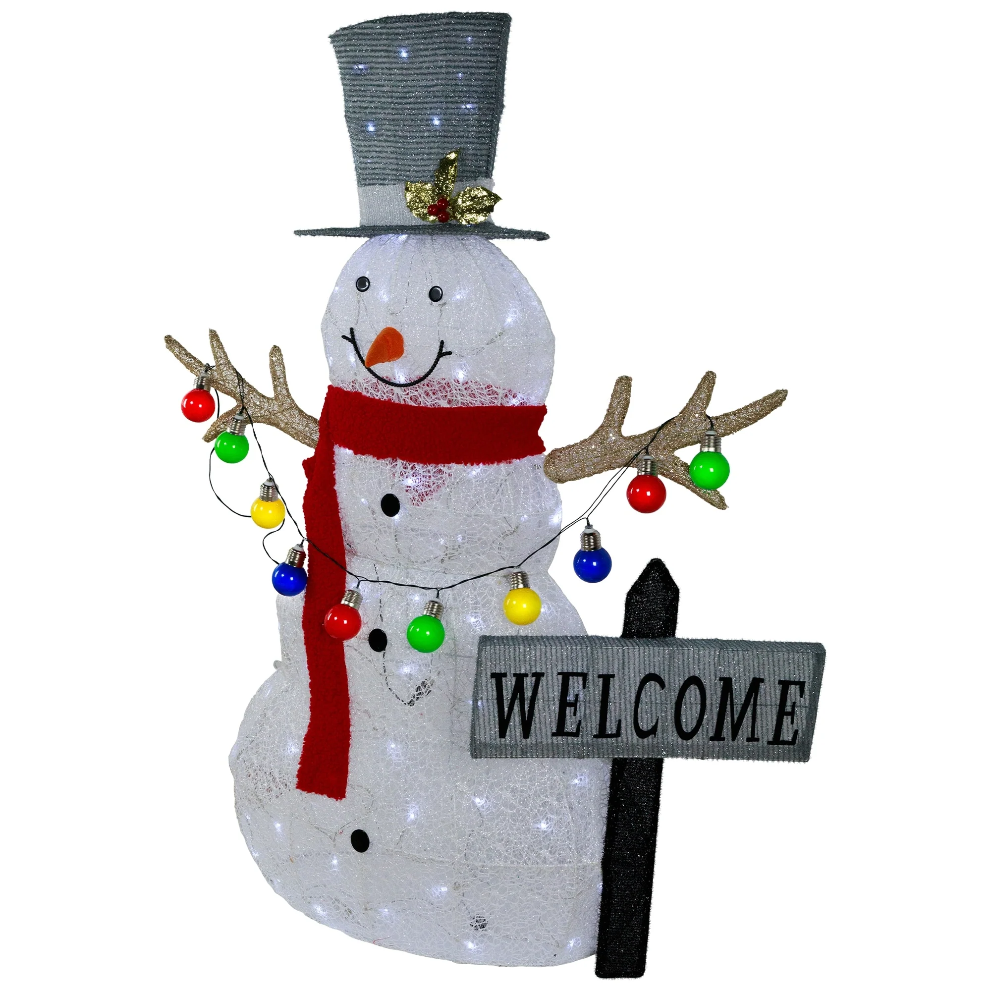 Add a cheerful vibe to your winter decor with this merry snowman dressed in a red scarf and a holly berry top hat. He is ready to greet your guests for some festivities with his "Welcome" sign. Designed with a 3-D feature, warm white LED lights, and holding a string of multi-color Christmas lights, he will be the focal point of your yard. Quick and easy installation lets you light up your outdoors in minutes. Grab yours today and add a festive touch to your holiday decor.