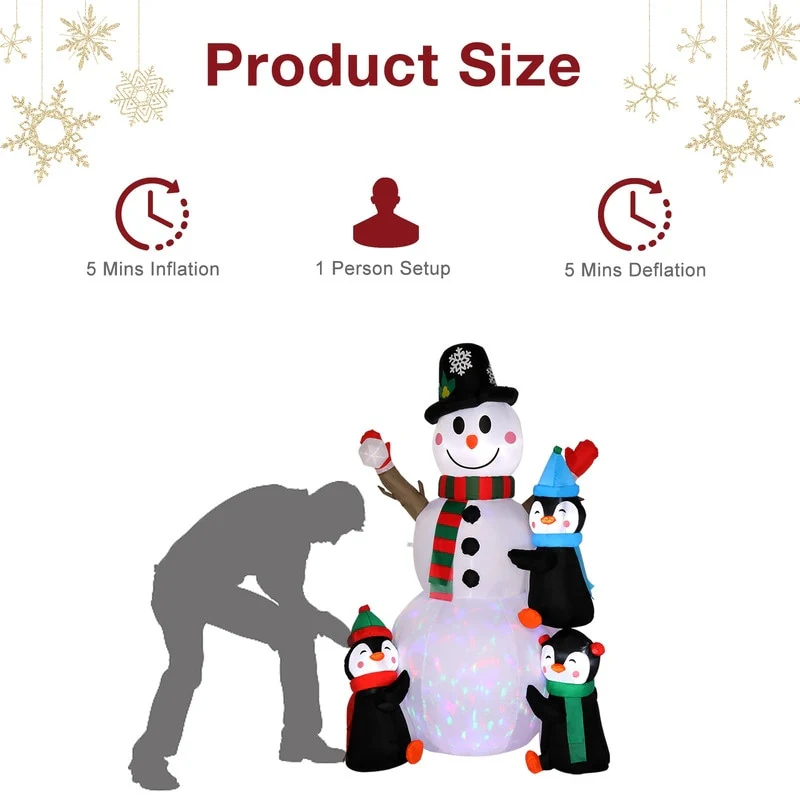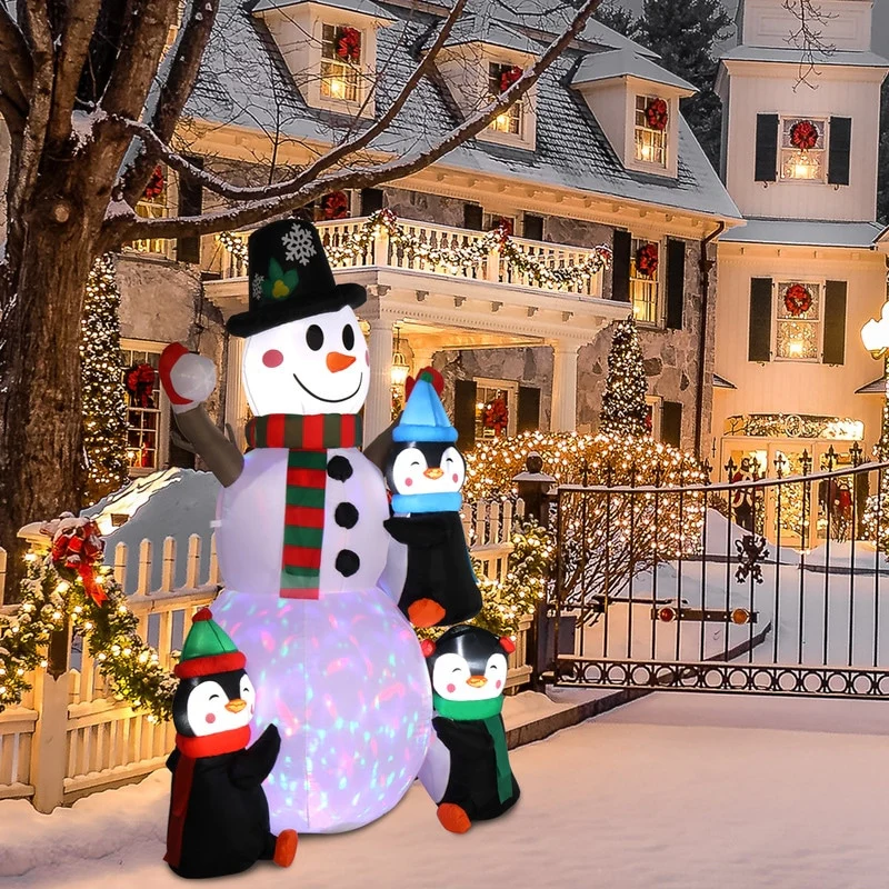Funny Inflatable Christmas Decorations for the Yard: A lovely 6ft high inflatable snowman with 2 penguins dressed up as a Christmas gift, wearing a Christmas hat, holding a gift, will make your kids squeal with delight and make your yard a big hit around neighbors.