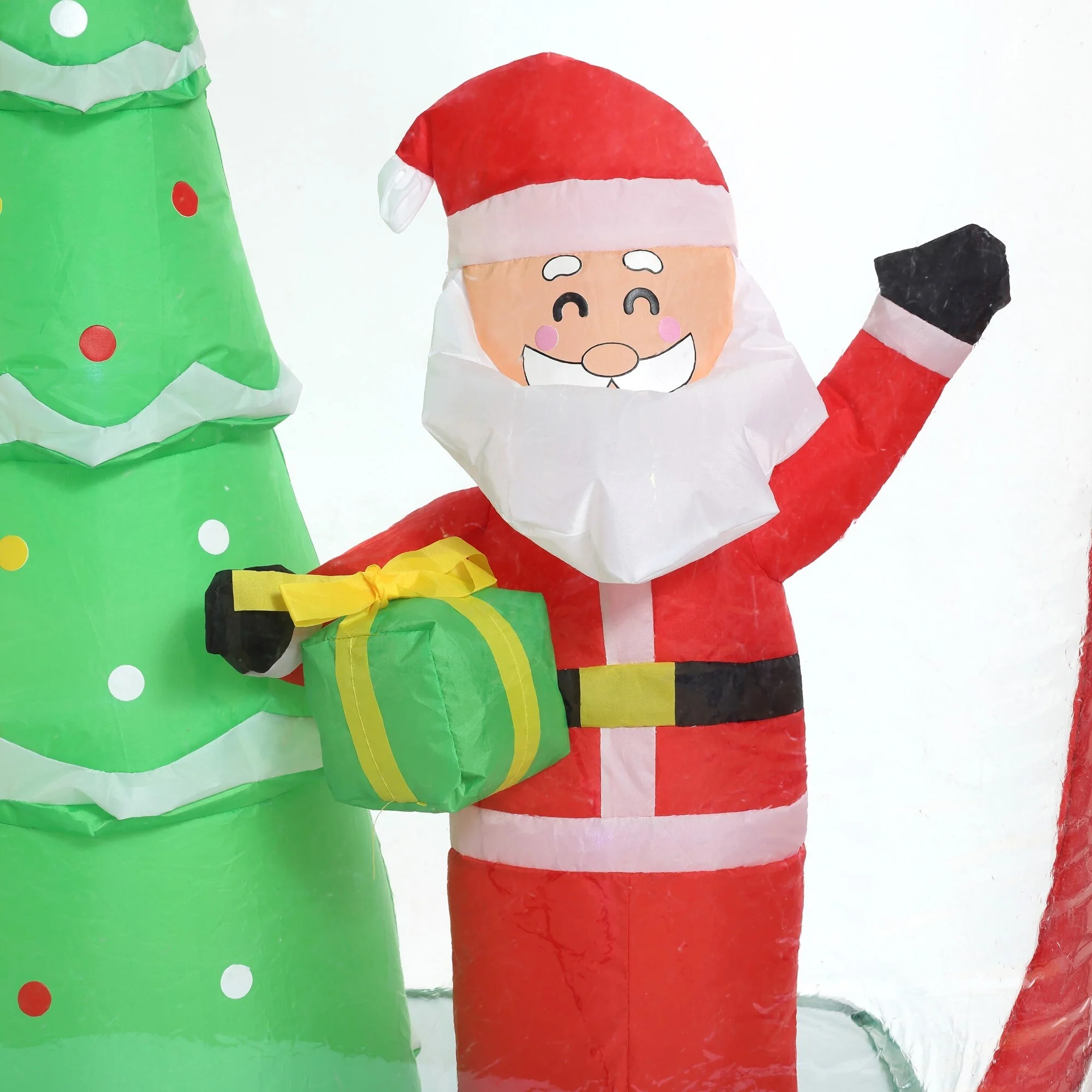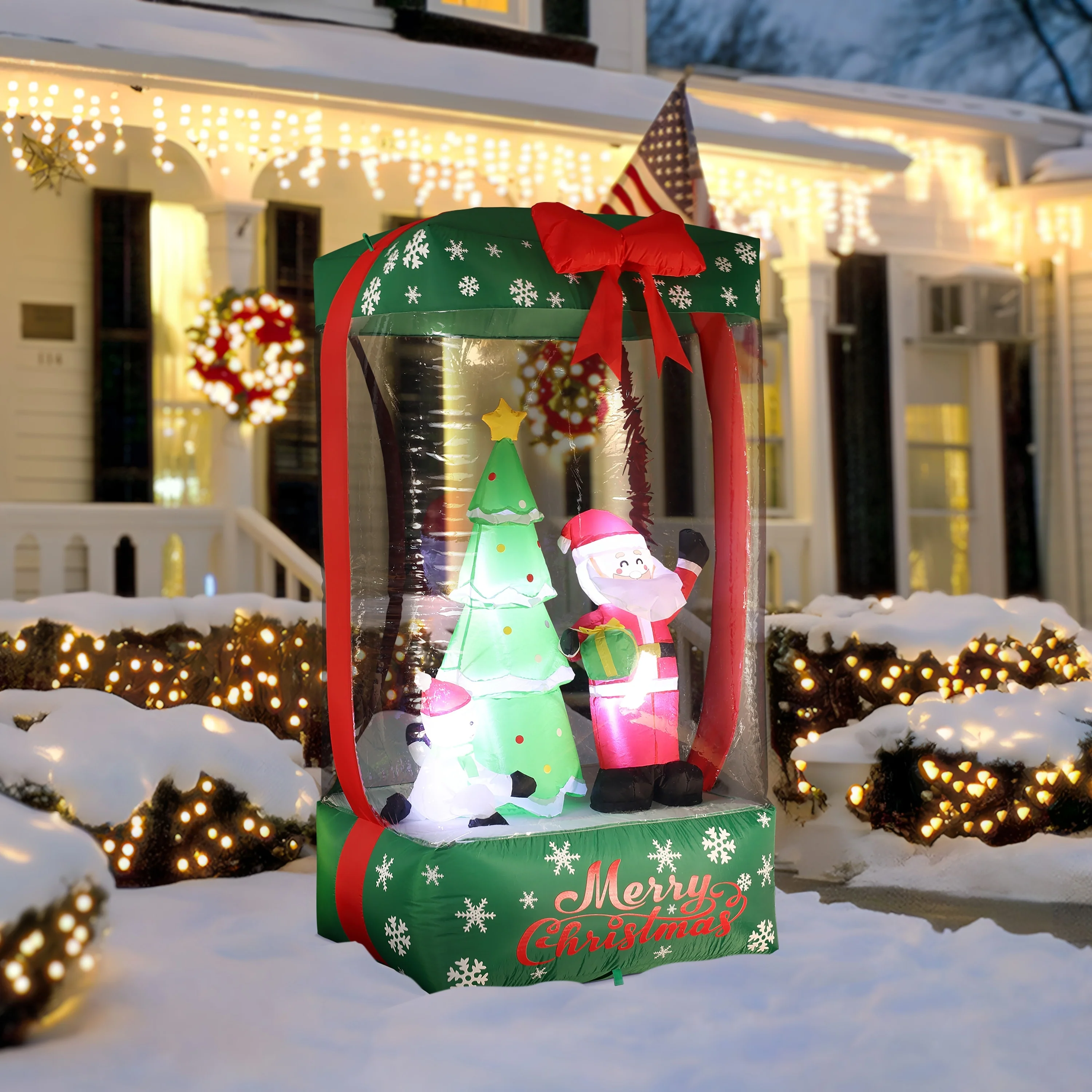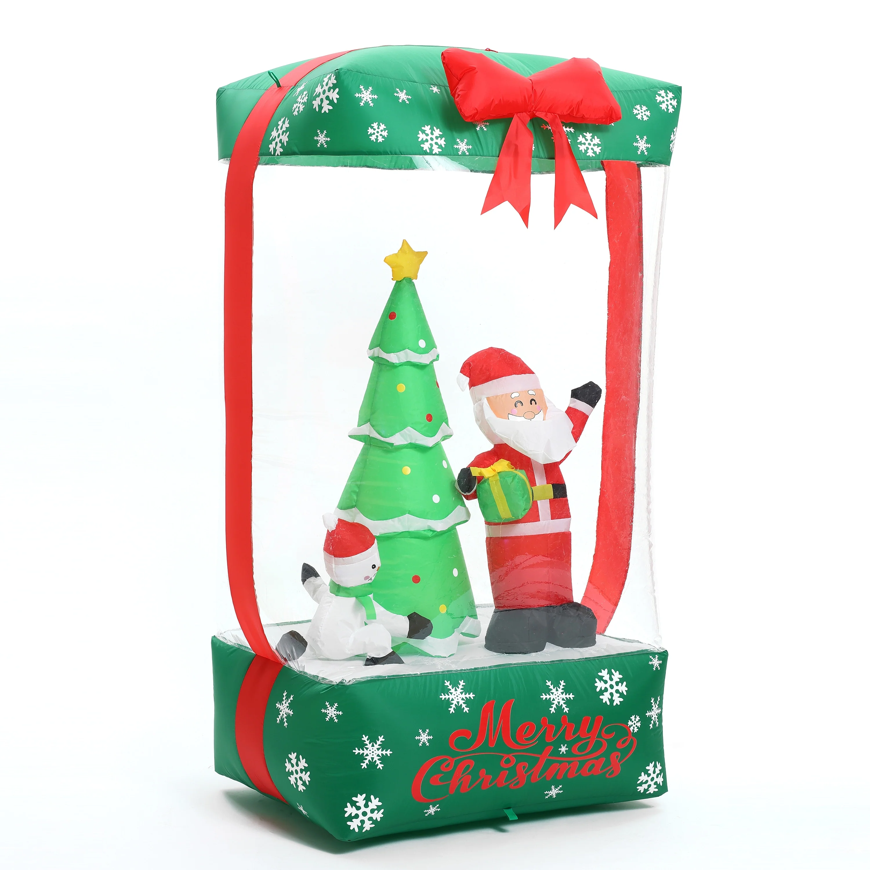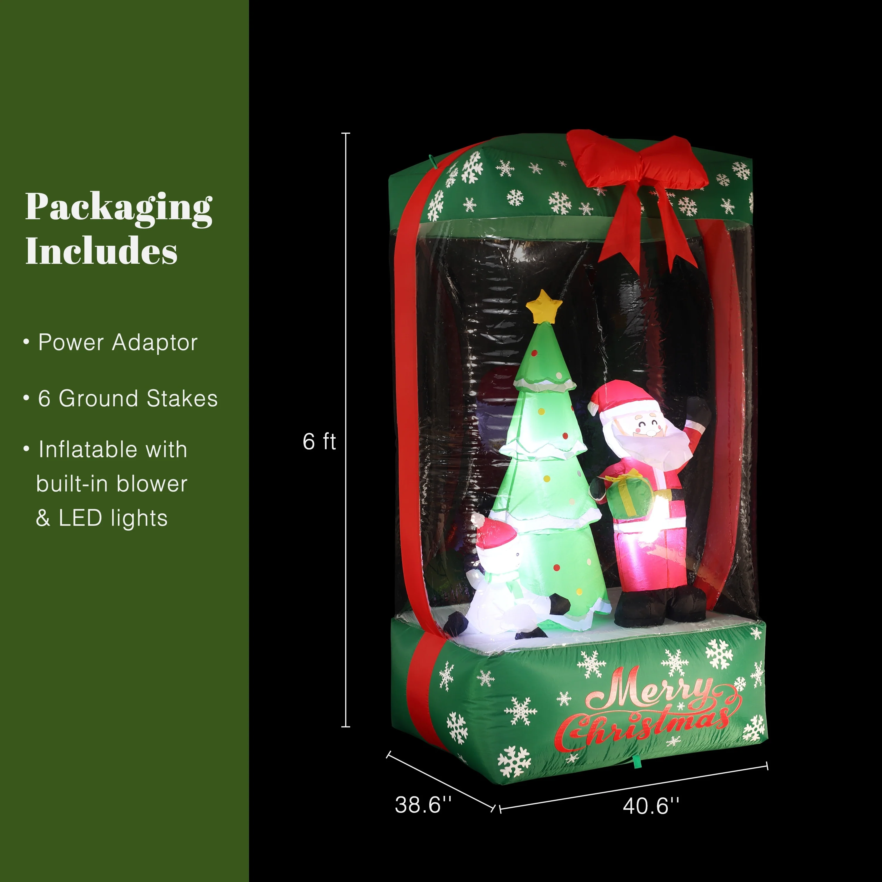 - Introducing our charming and fun 6-foot Holiday Santa Display Inflatable with Lights that resembles a holiday gift, adding a playful touch to your decor.