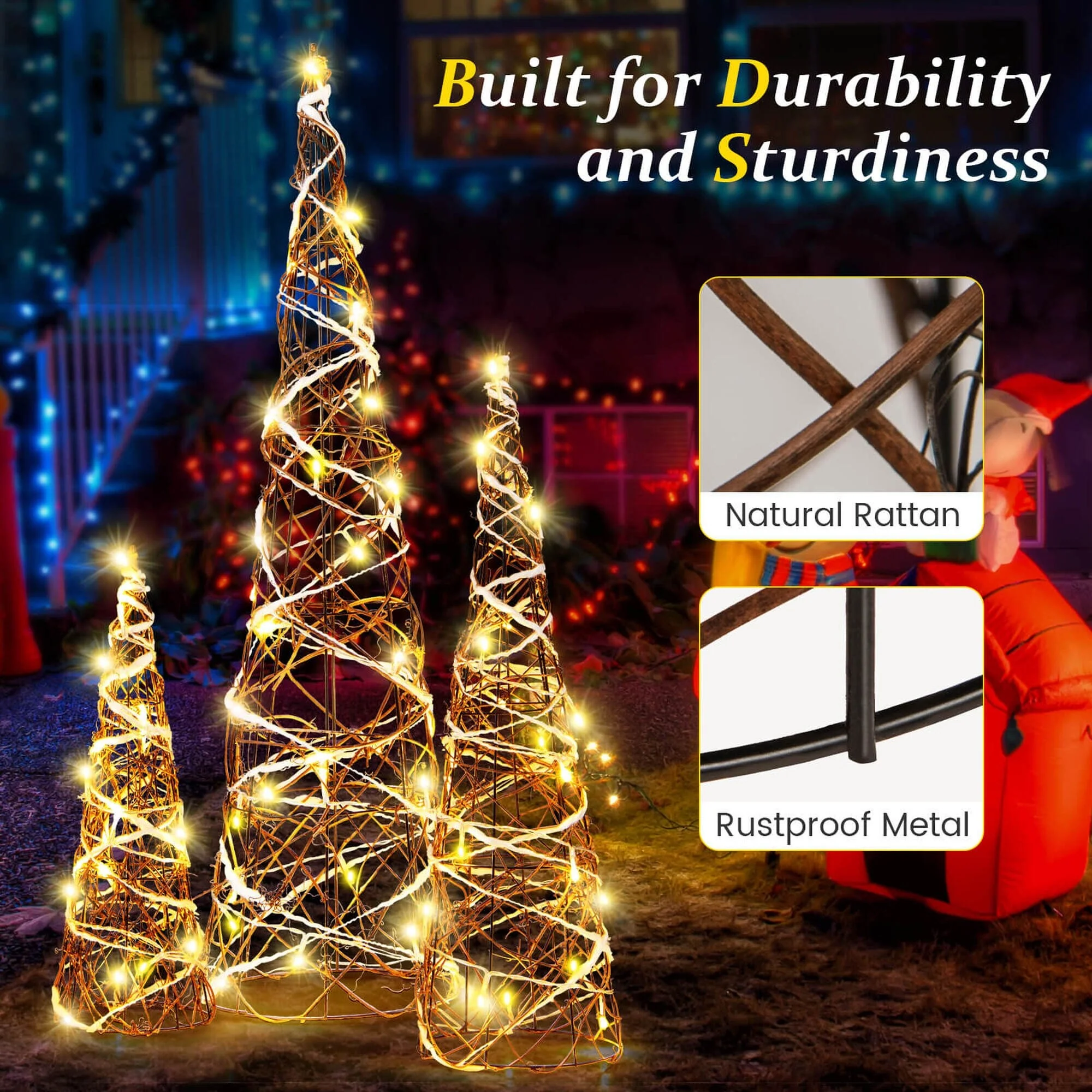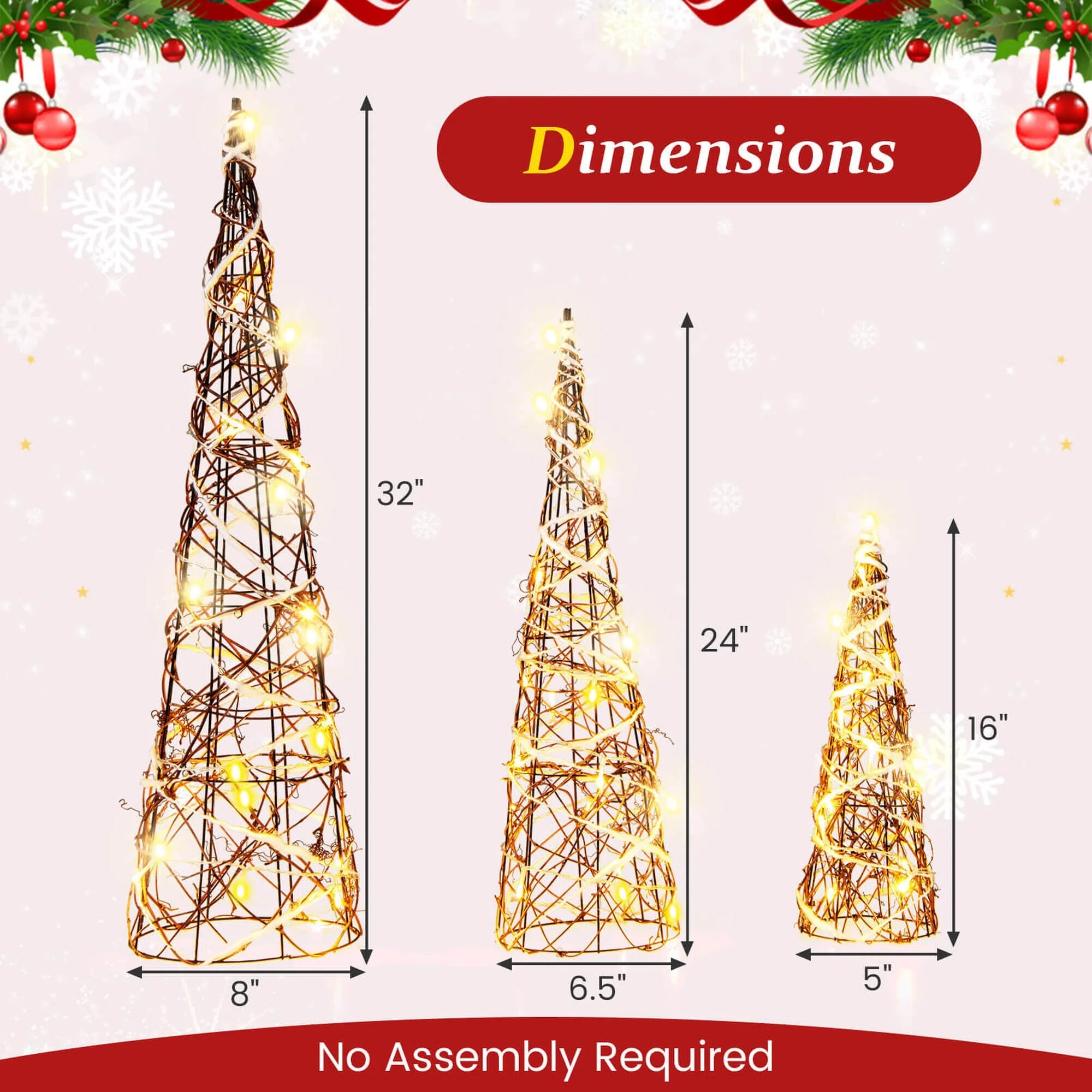 Costway 32" 24" 16" Set of 3 Lighted Rattan Cone Trees with LED Lights - Brown - See Details