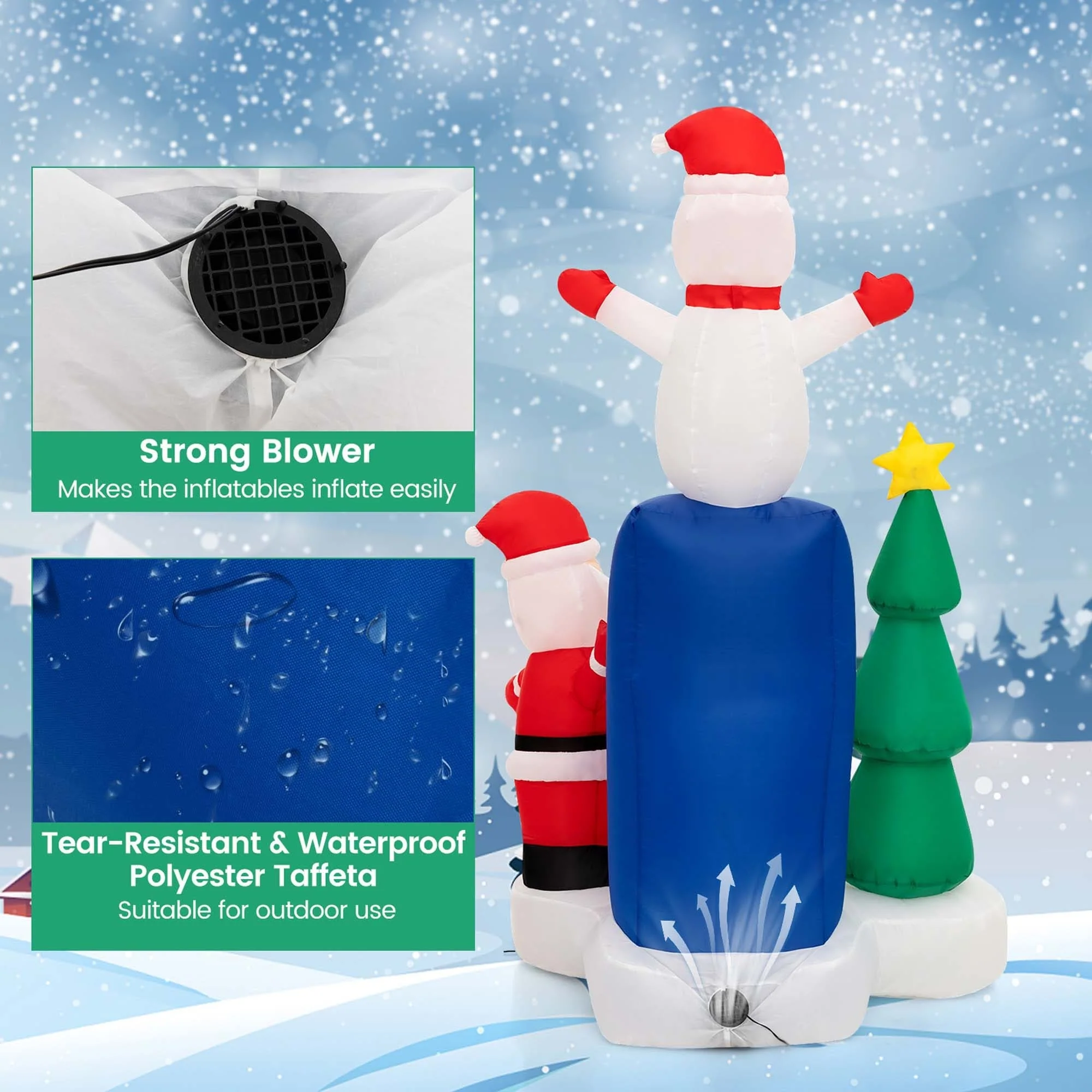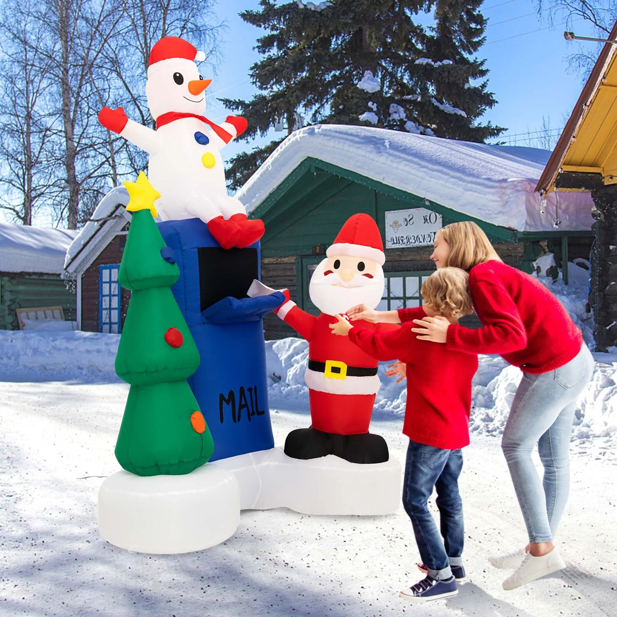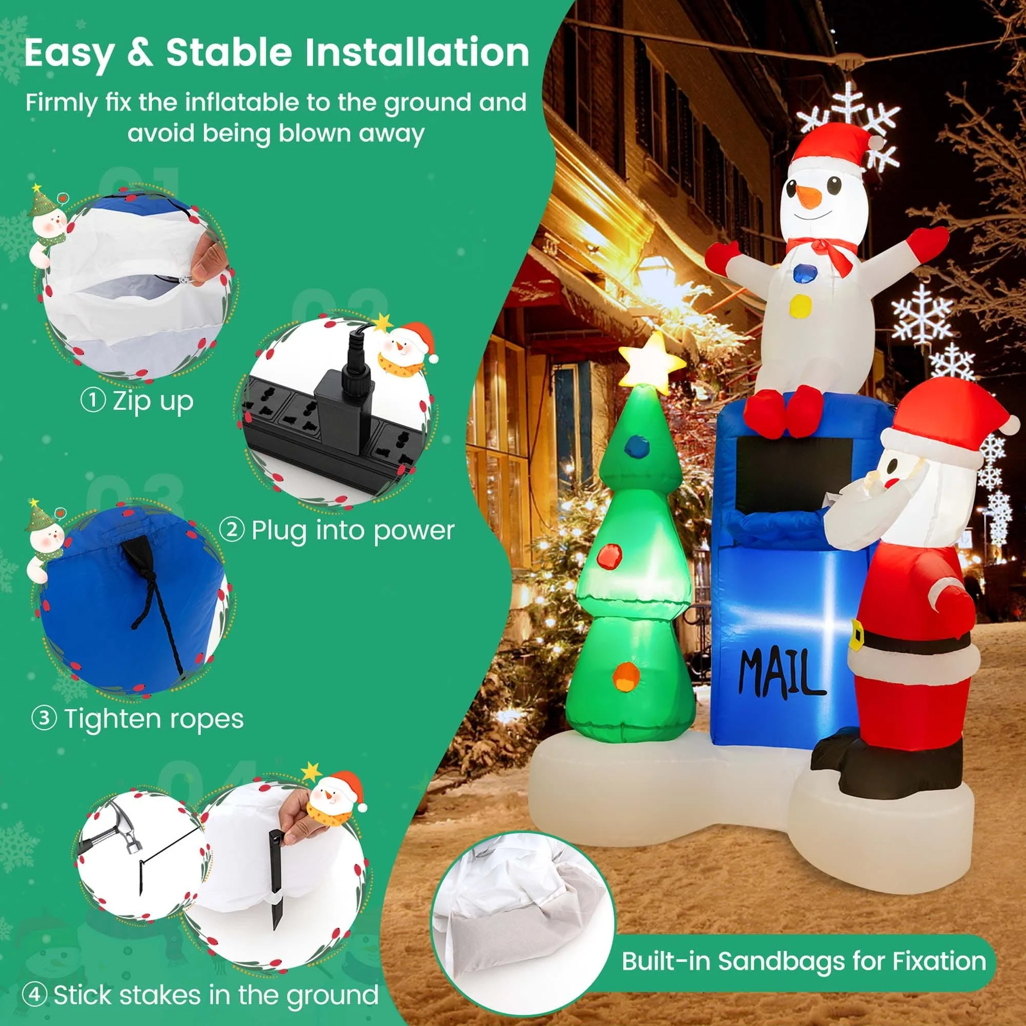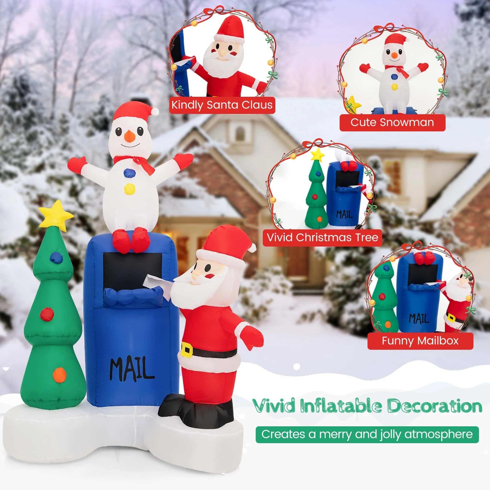 Are you looking to add some festive cheer to your home this Christmas? Look no further than our lighted Christmas inflatables decoration. It consists of a kindly Santa Claus, a cute snowman, a vivid Christmas tree, and a funny mailbox, which is perfect for adding a touch of magic to your outdoor Christmas display. Moreover, With 5 bright LED lights inside, it illuminates the night with a bright glow, creating an inviting ambiance. And thanks to your strong blower, you can easily set it up in a few minutes. Besides, for added stability, there are stakes and built-in sandbags that securely hold the inflatables in place. The lighted Christmas inflatables will undoubtedly become the centerpiece of your Christmas display, enchanting both young and old with its festive and whimsical design.