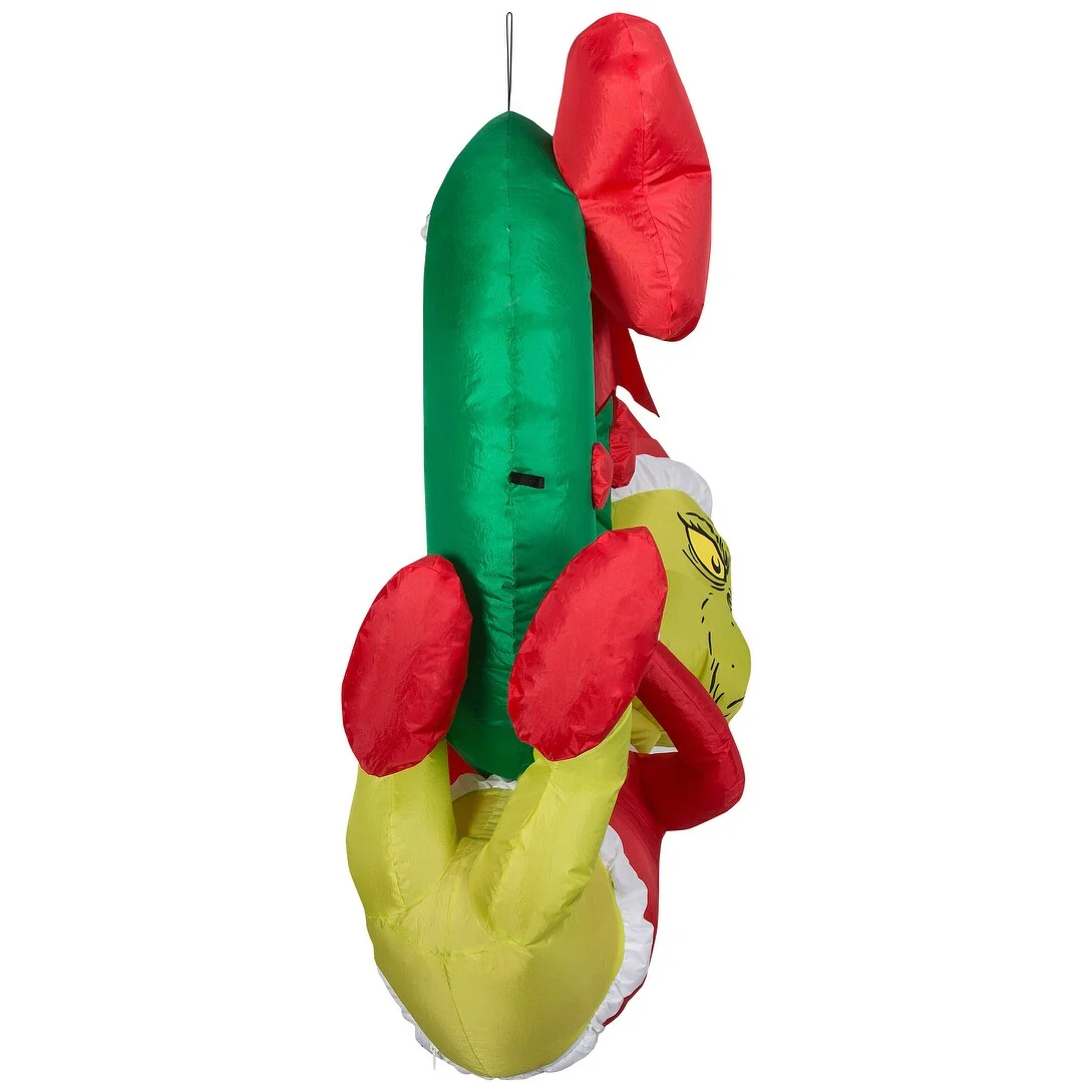 Add an eye-catching addition to your indoor or outdoor Christmas decorations with a hanging Airblown® Inflatable Grinch! This unique Grinch inflatable hangs from your roofline or eaves for an unexpected and delightful display. Features the Grinch in his Santa suit hanging from a wreath with a big red bow and ornaments. This amazing Grinch Christmas decoration sets up in a snap. Just plug it in, hang it and watch the magic unfold. Includes everything needed for easy outdoor setup.