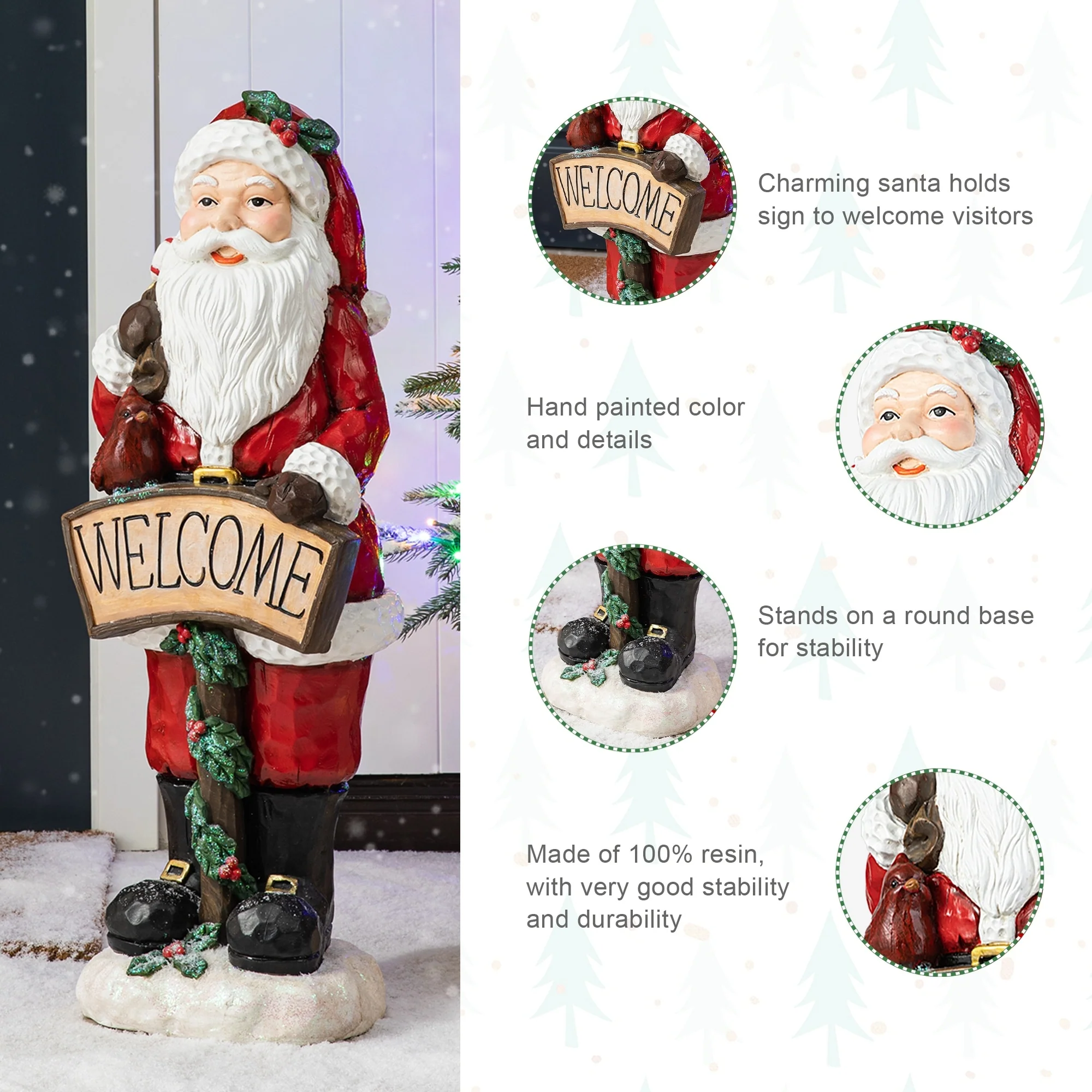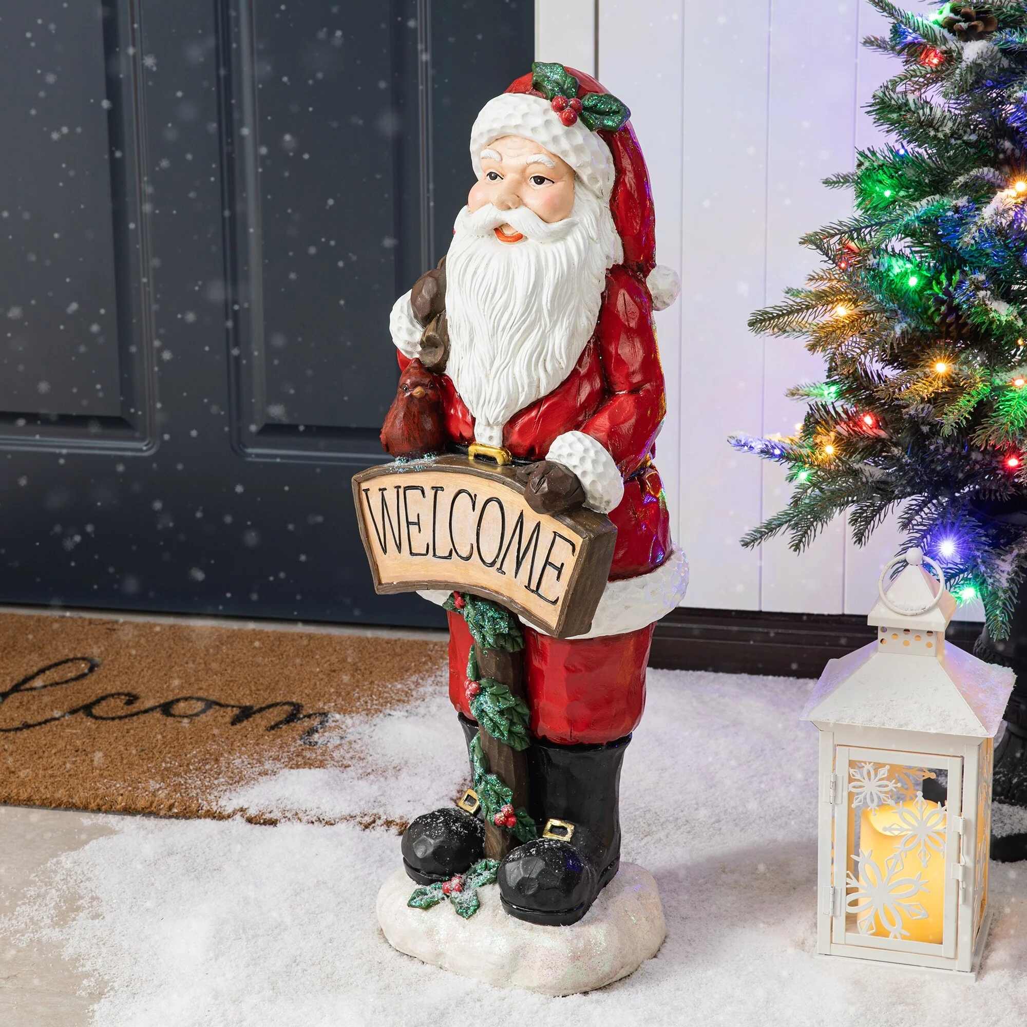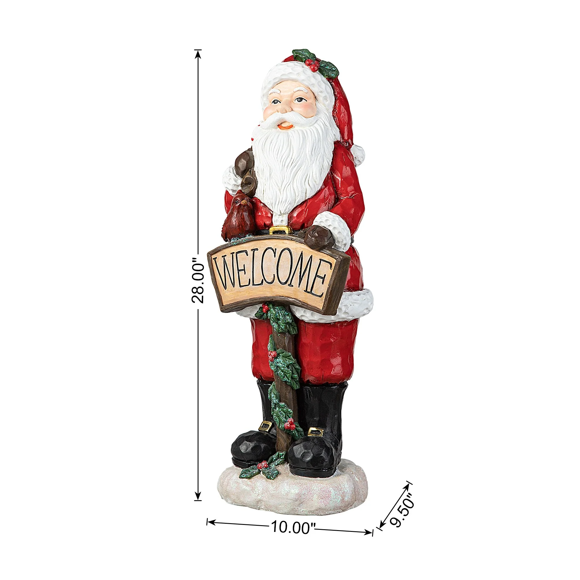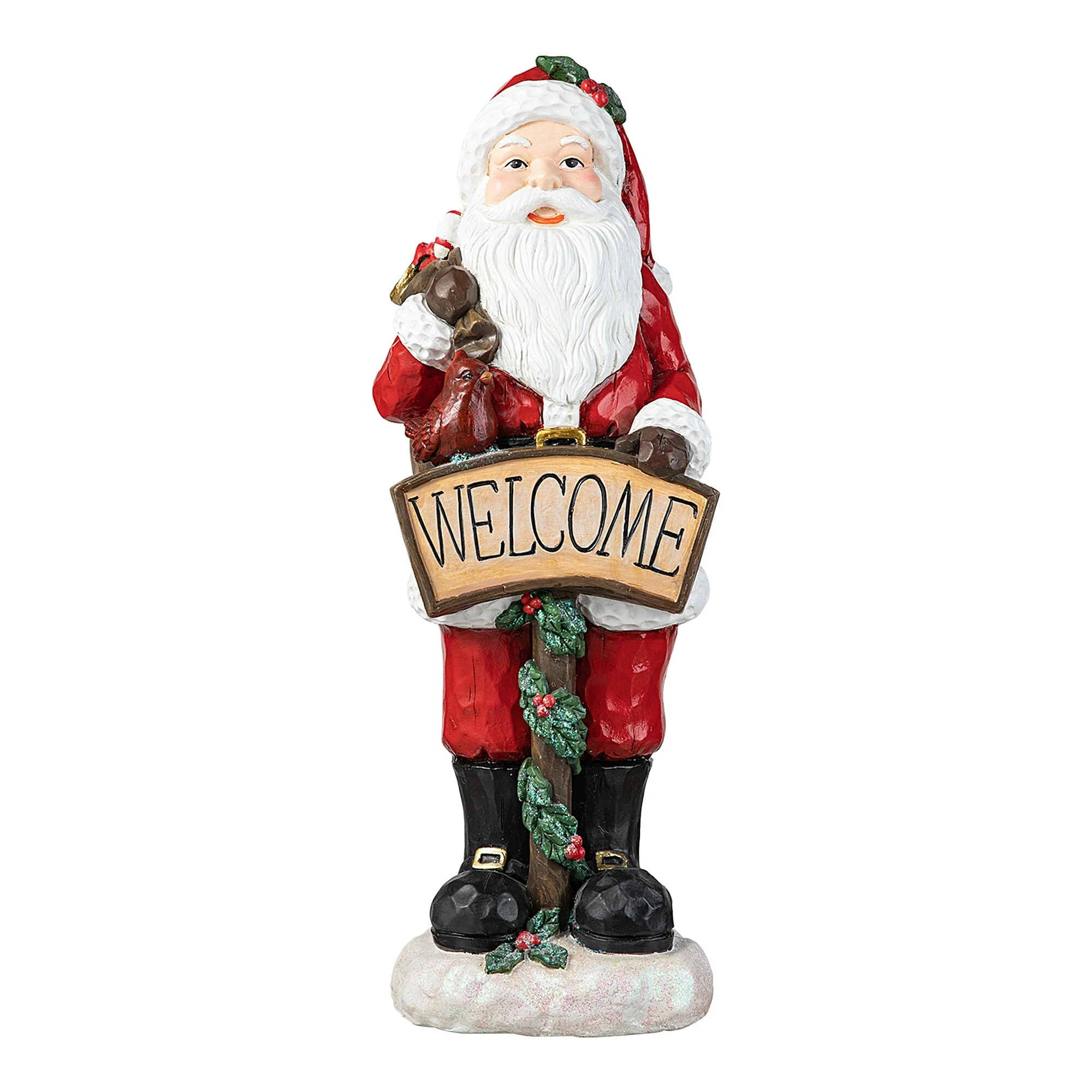 This 28"H resin Santa holding a large ""WELCOME"" sign while carrying a gift bag on his back, adding a touch of Christmas magic to your entrance. It will add a rich festive atmosphere to your home, becoming the focal point that captures the attention of neighbors and guests.