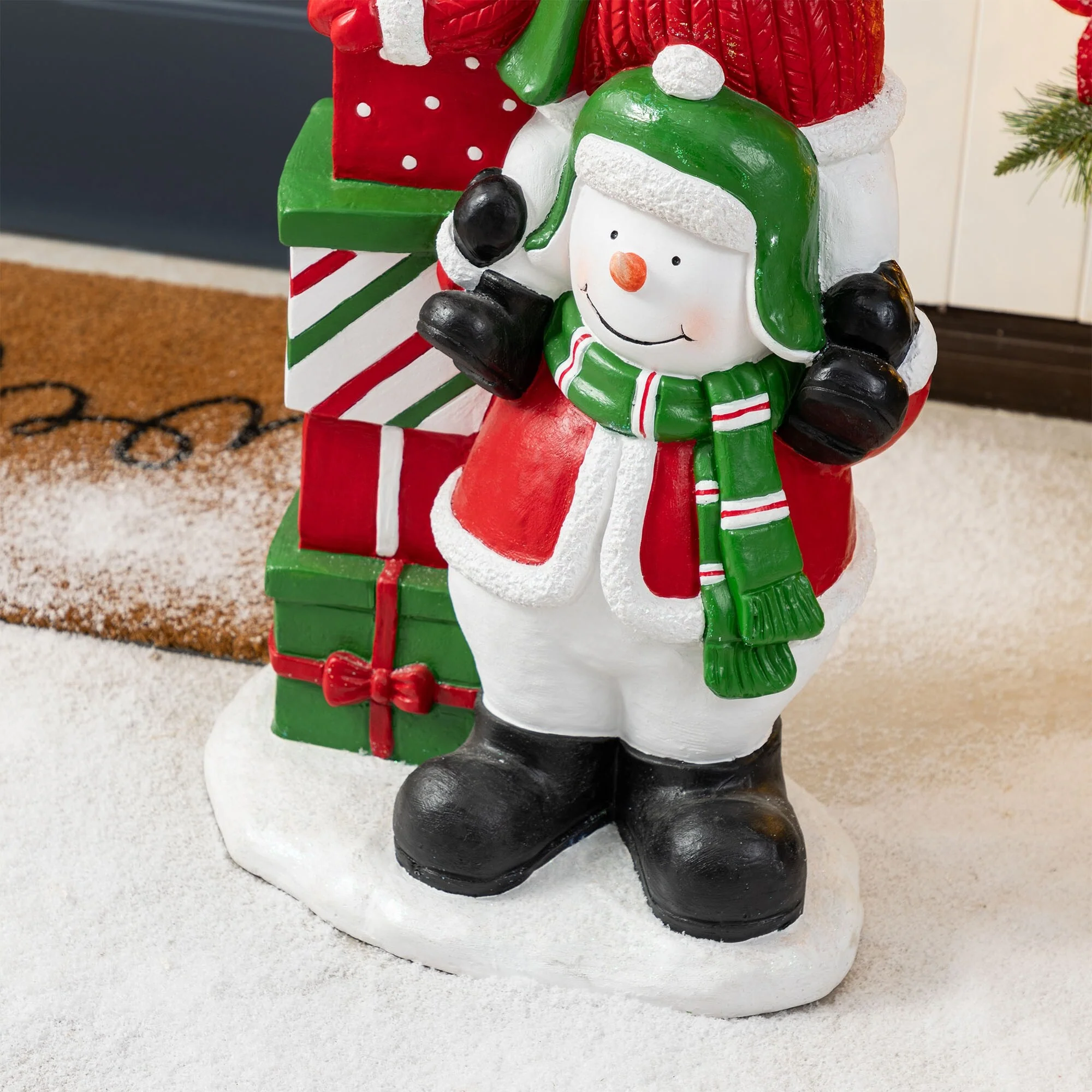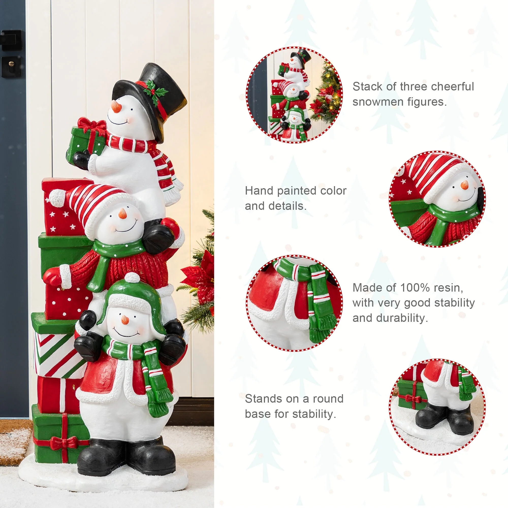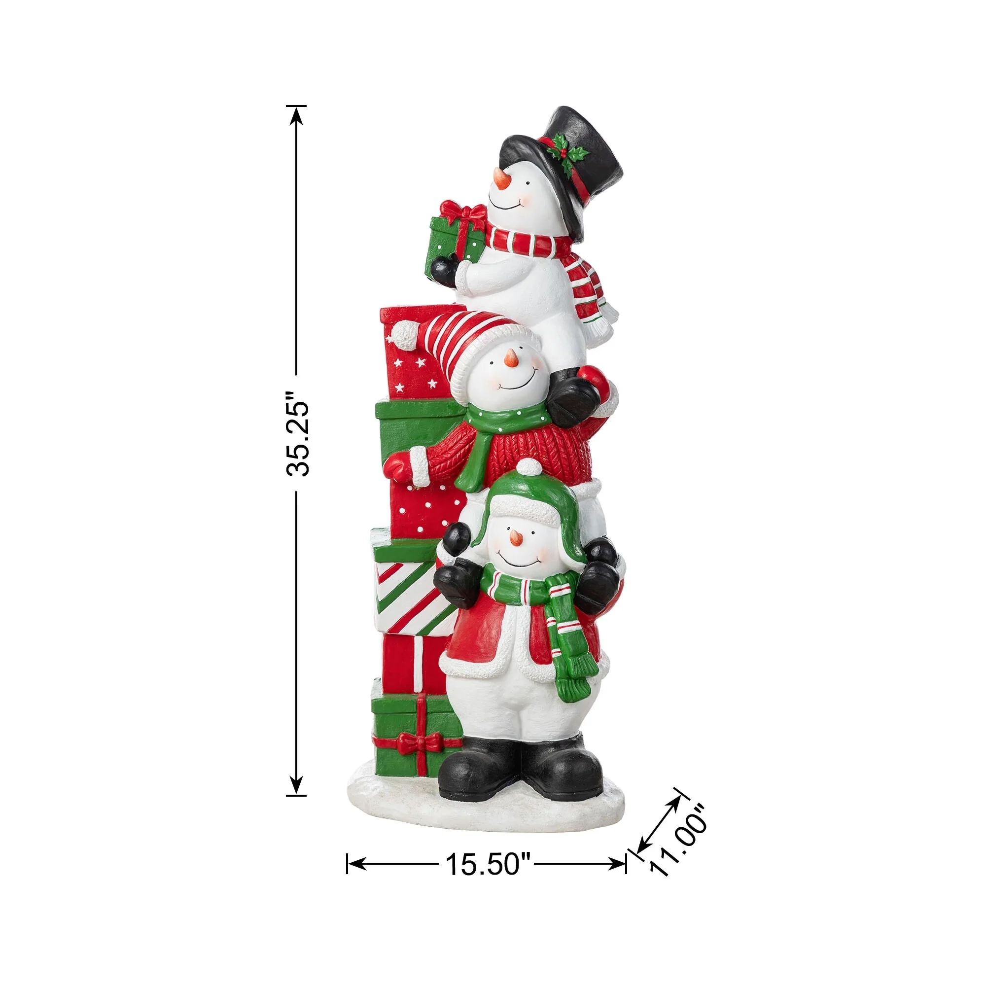 The 35.25"H Christmas Resin Porch Decor is a festive and playful holiday decoration that features a stack of three delightful snowmen, each adorned with colorful scarves and hats, and holding various Christmas-themed items, creating a charming and inviting display that adds a sense of holiday cheer to any porch or entryway.