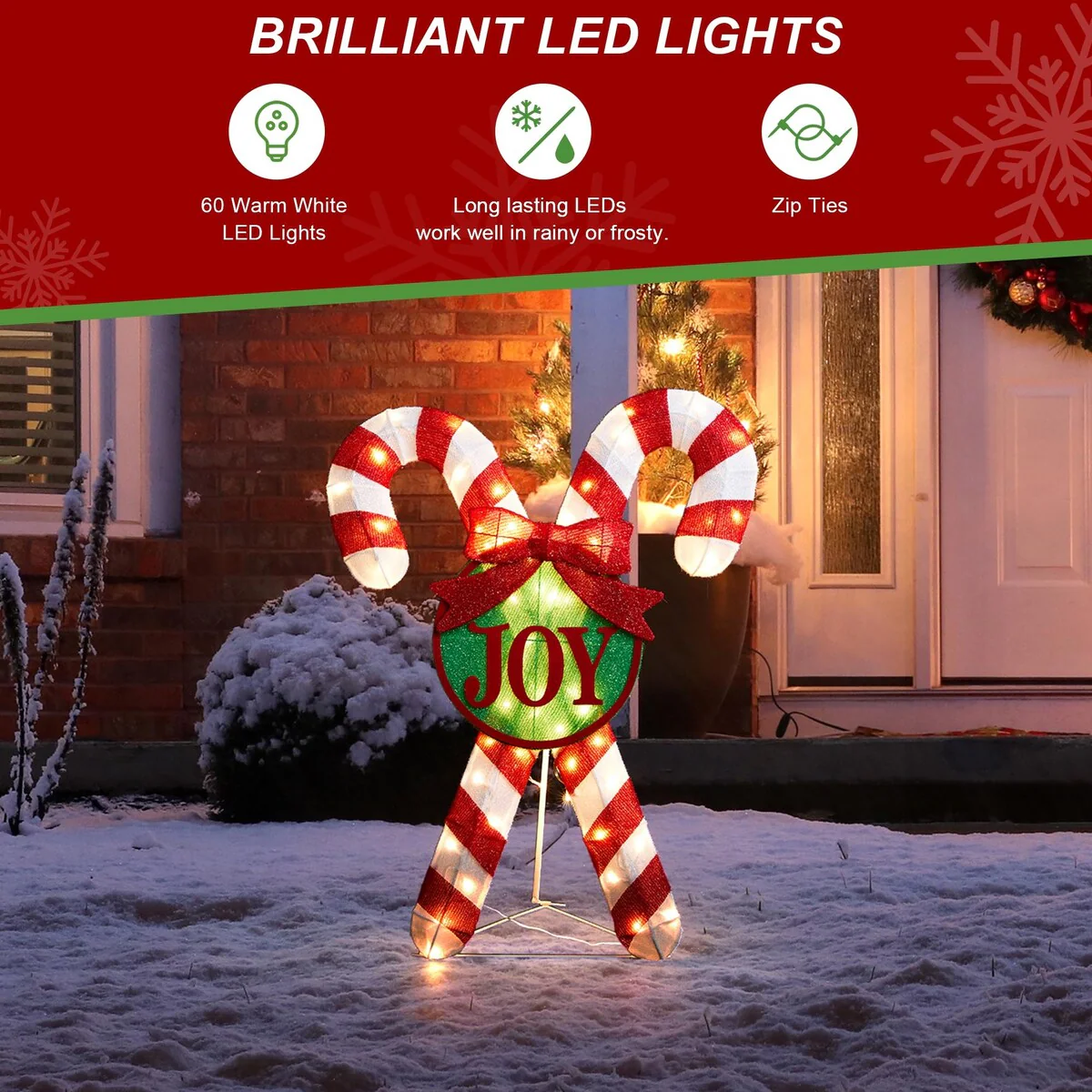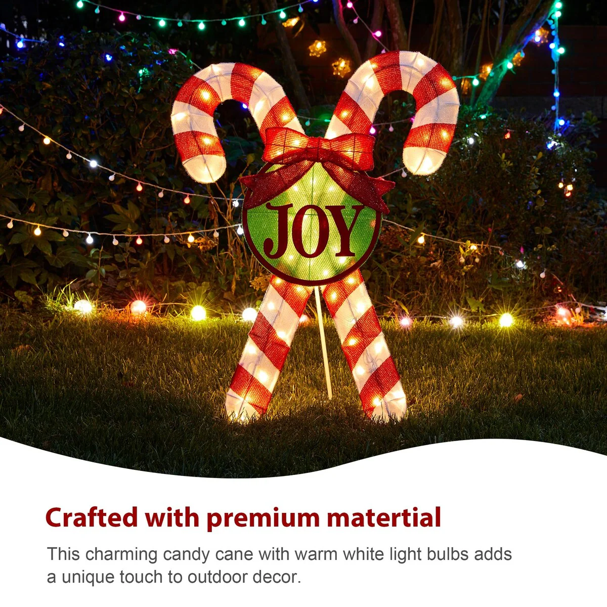 The charming candy cane designed with warm white bulbs adds a unique and visually appealing touch to your outdoor decorations and create a vibrant and joyful atmosphere during the Christmas season.