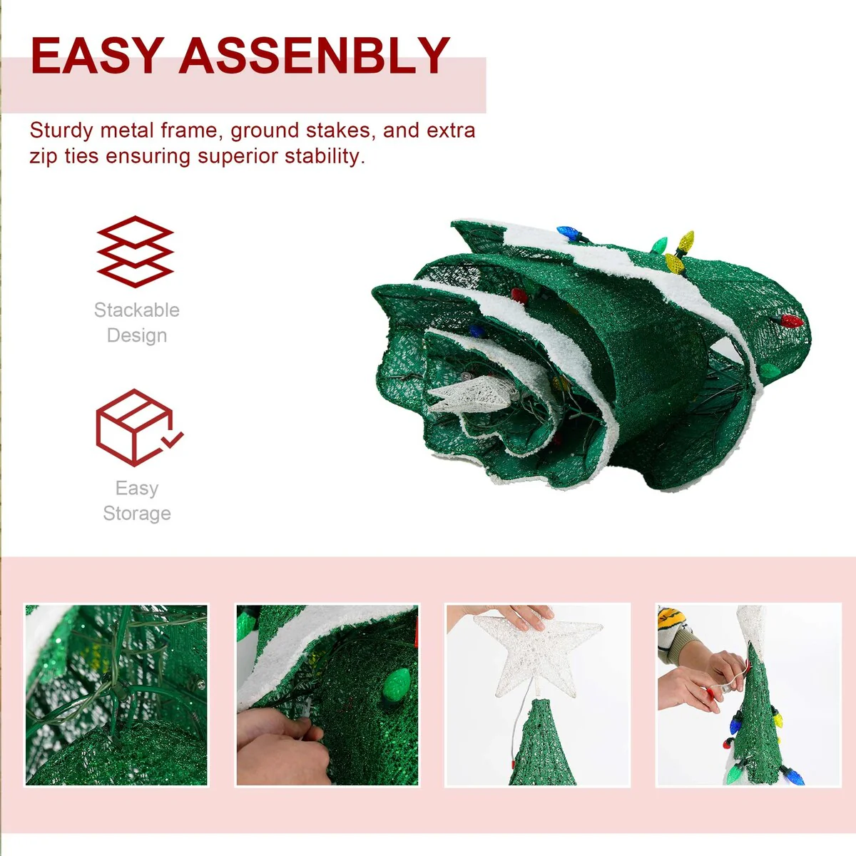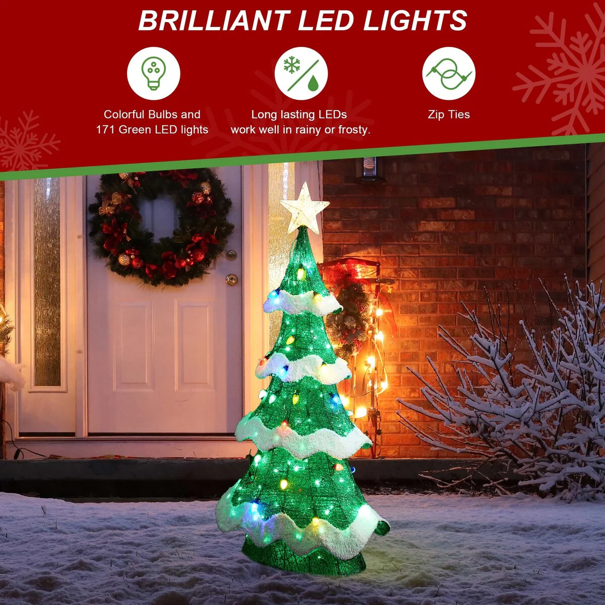 The 3D mesh design of this Christmas tree with green and colorful twinkle effect bulbs adds a unique and visually appealing touch to your outdoor decorations and create a vibrant and joyful atmosphere during the Christmas season.