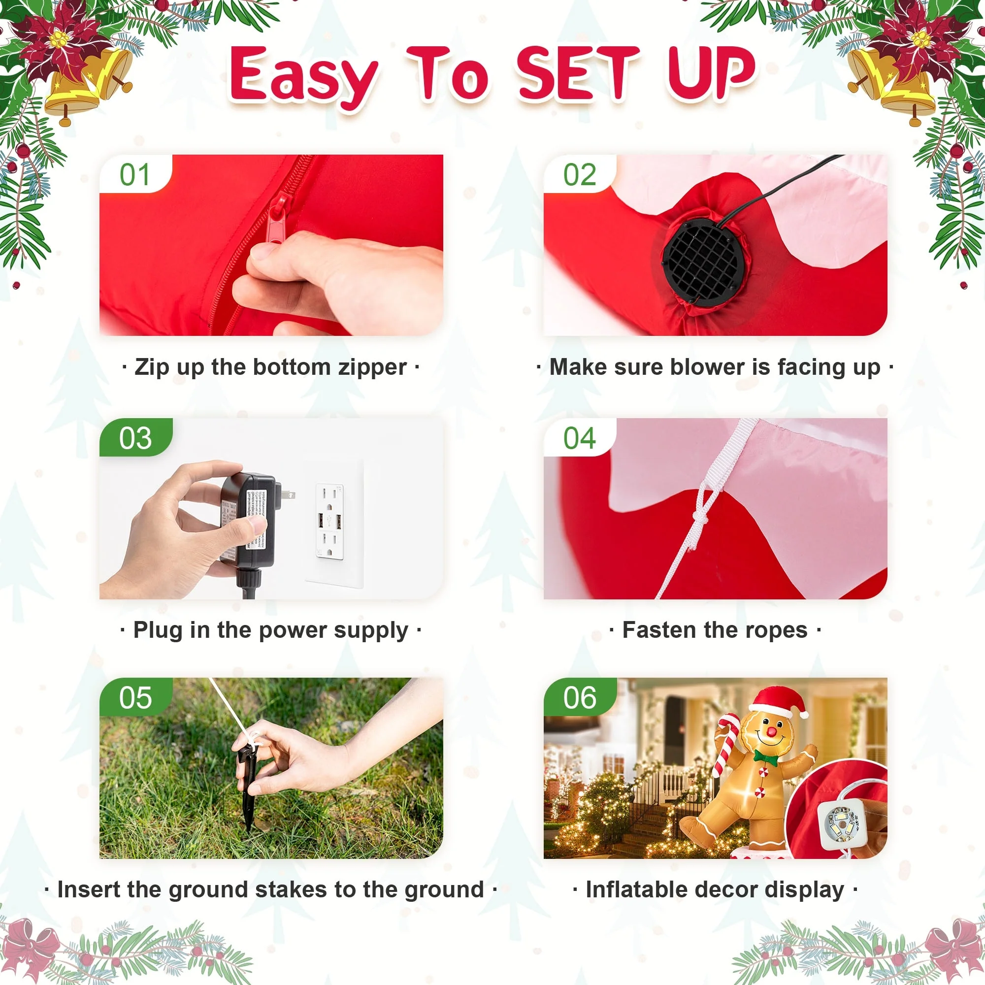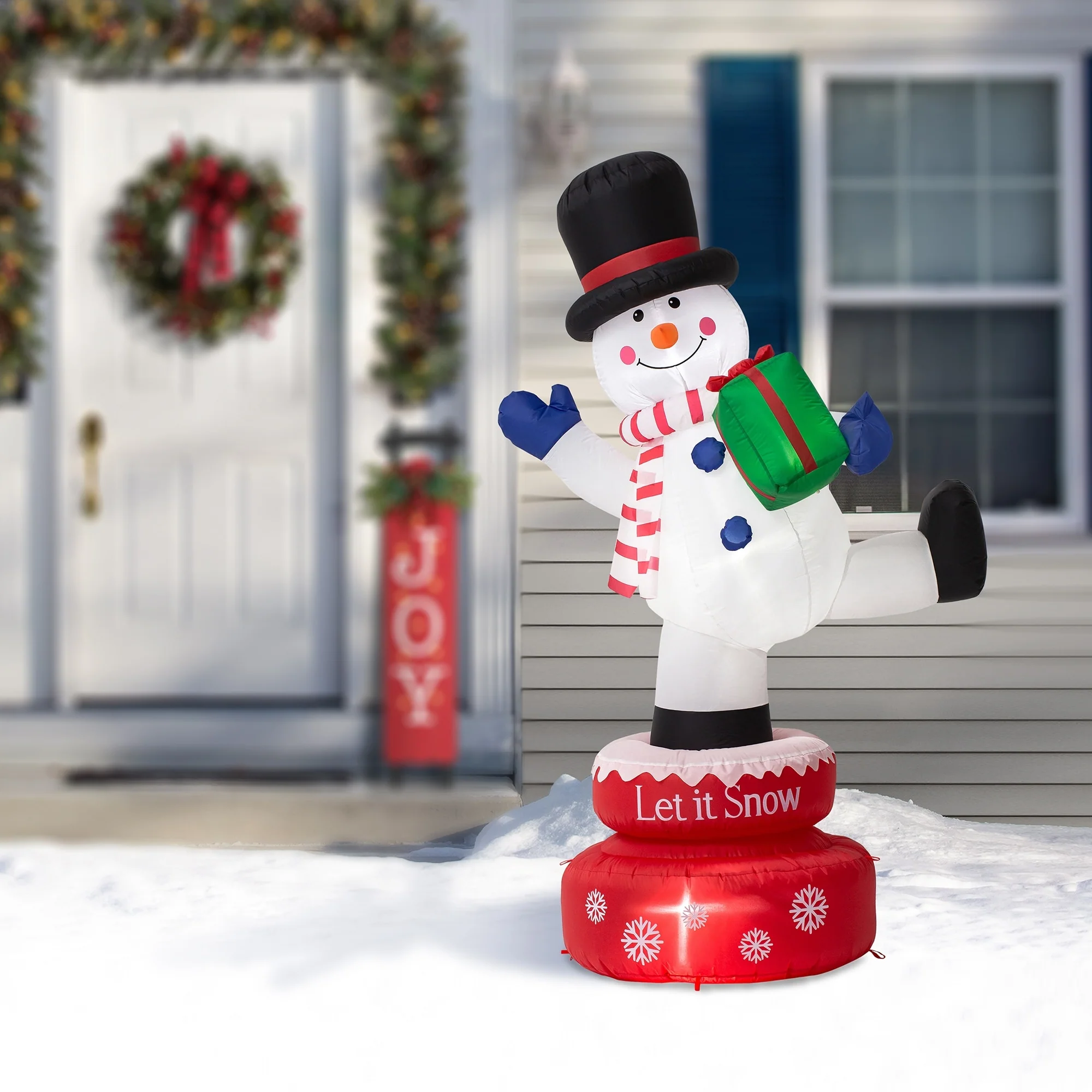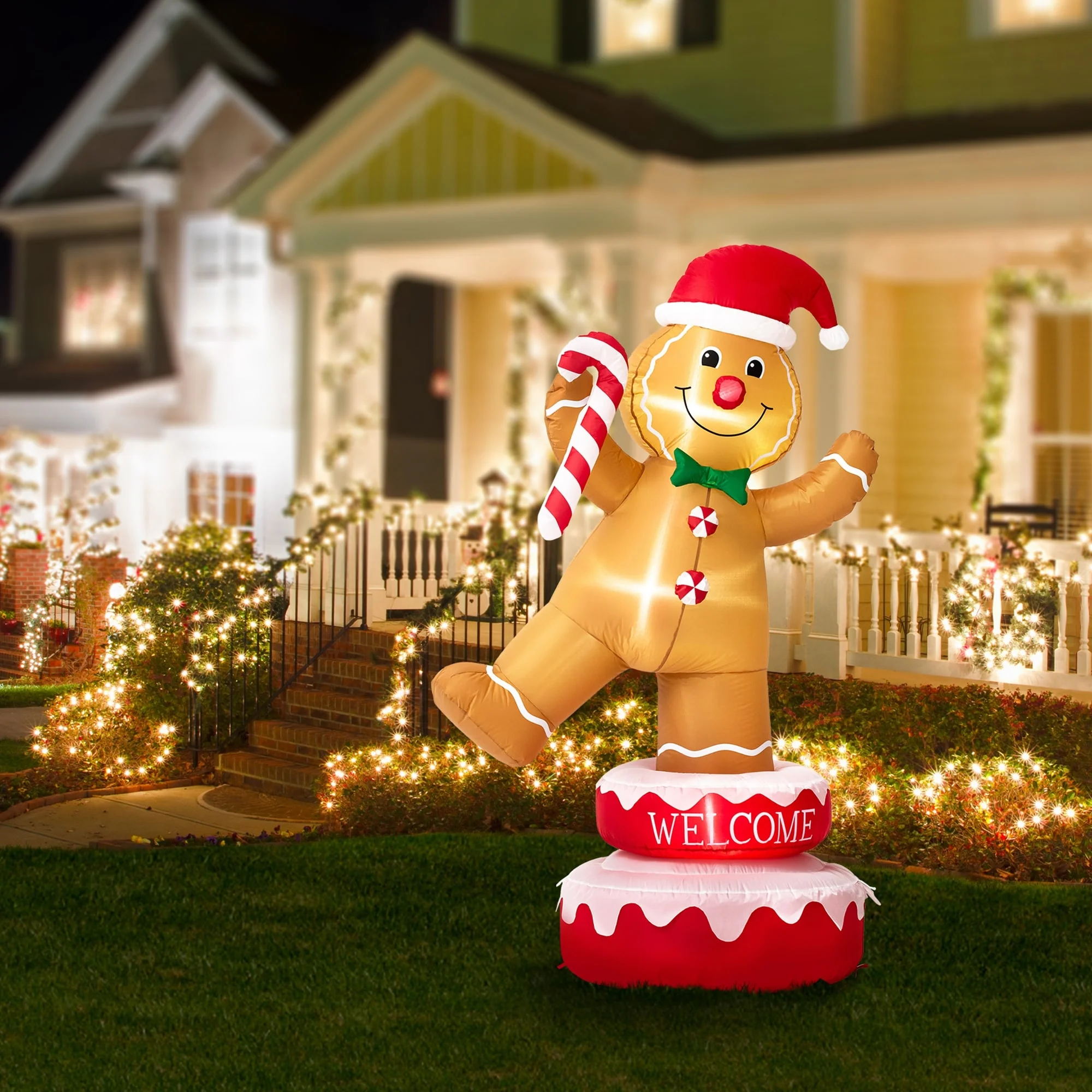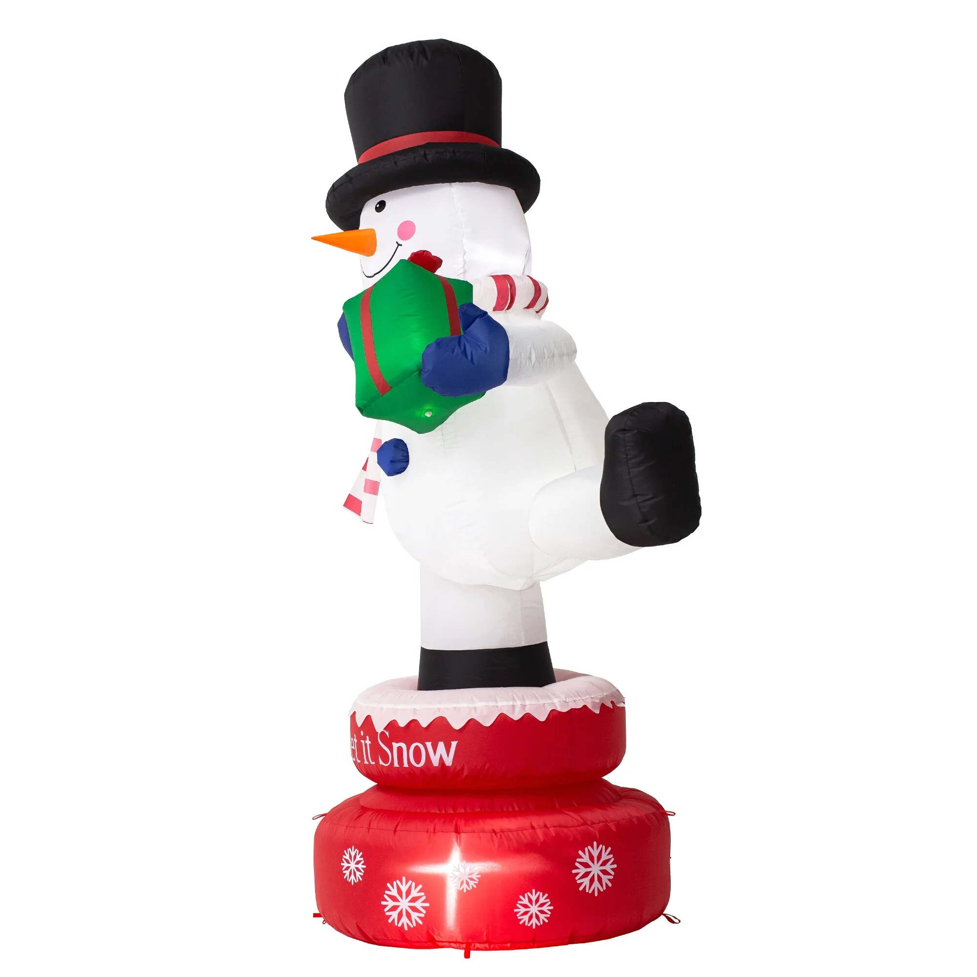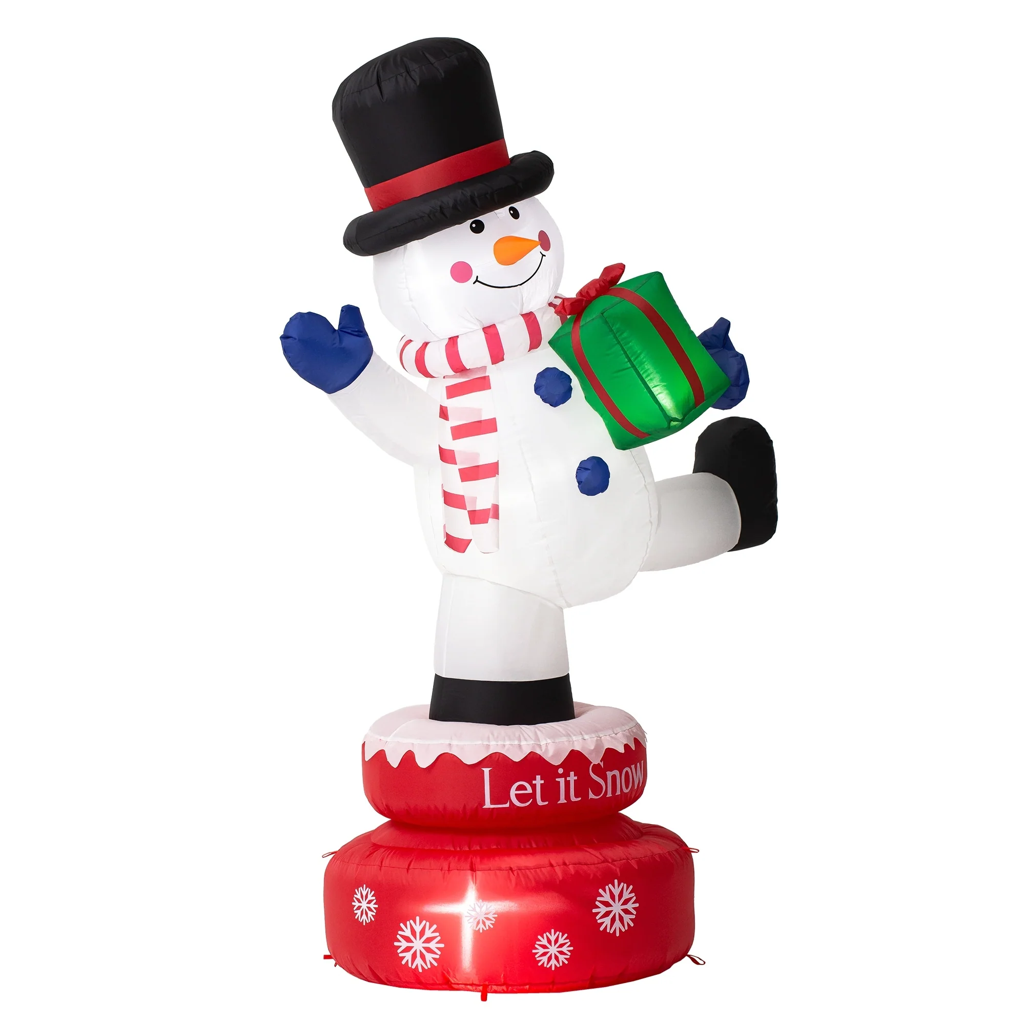 Decorate your yard for Christmas with this 360-degree auto-rotate Snowman or Gingerbread Man inflatable decor. Holds a gift box, and wears a top hat, striped scarf and blue gloves, this snowman is smiling and waving to you. Holds a candy cane and wears a Christmas hat, this Gingerbread man is smiling and waving to you. Designed with ultra-durable, weather-resistant polyester and featuring an internal white LED glow, these holiday decors will create a festive focal point in your yard. 2 tethers and 5 ground stakes ensure high stability.