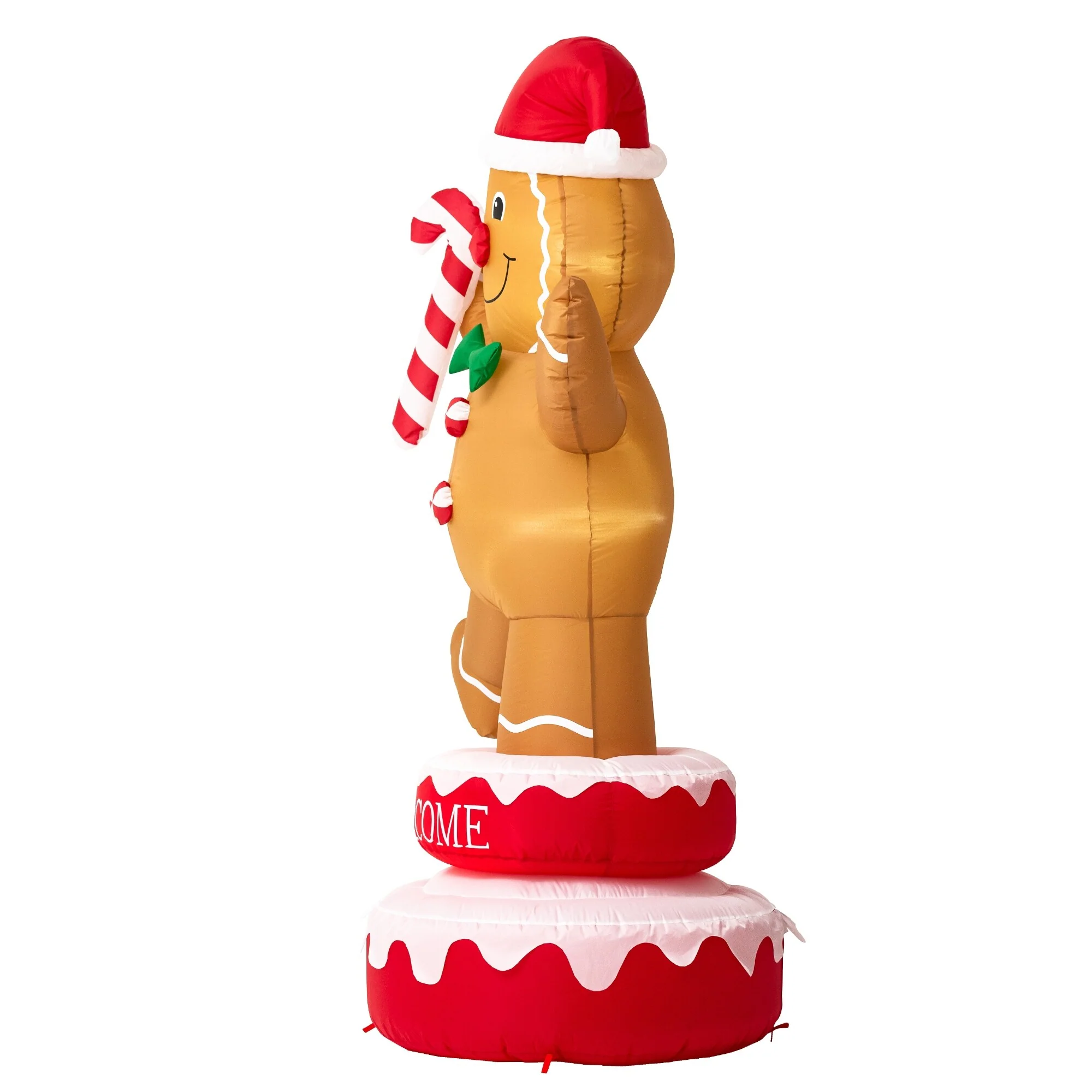 - Cute Gingerbread Man is holding a candy cane and waving, crafted from high-quality weatherproof nylon fabric.