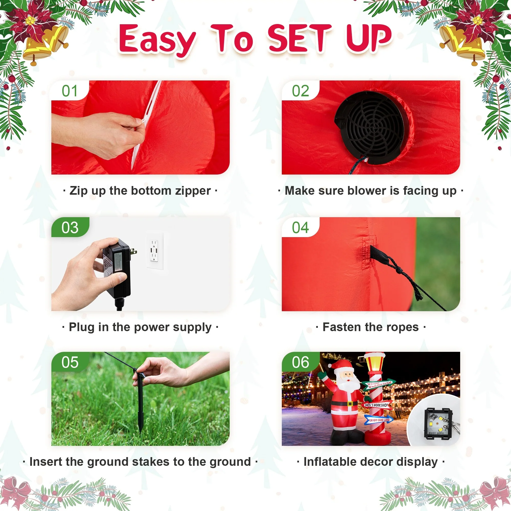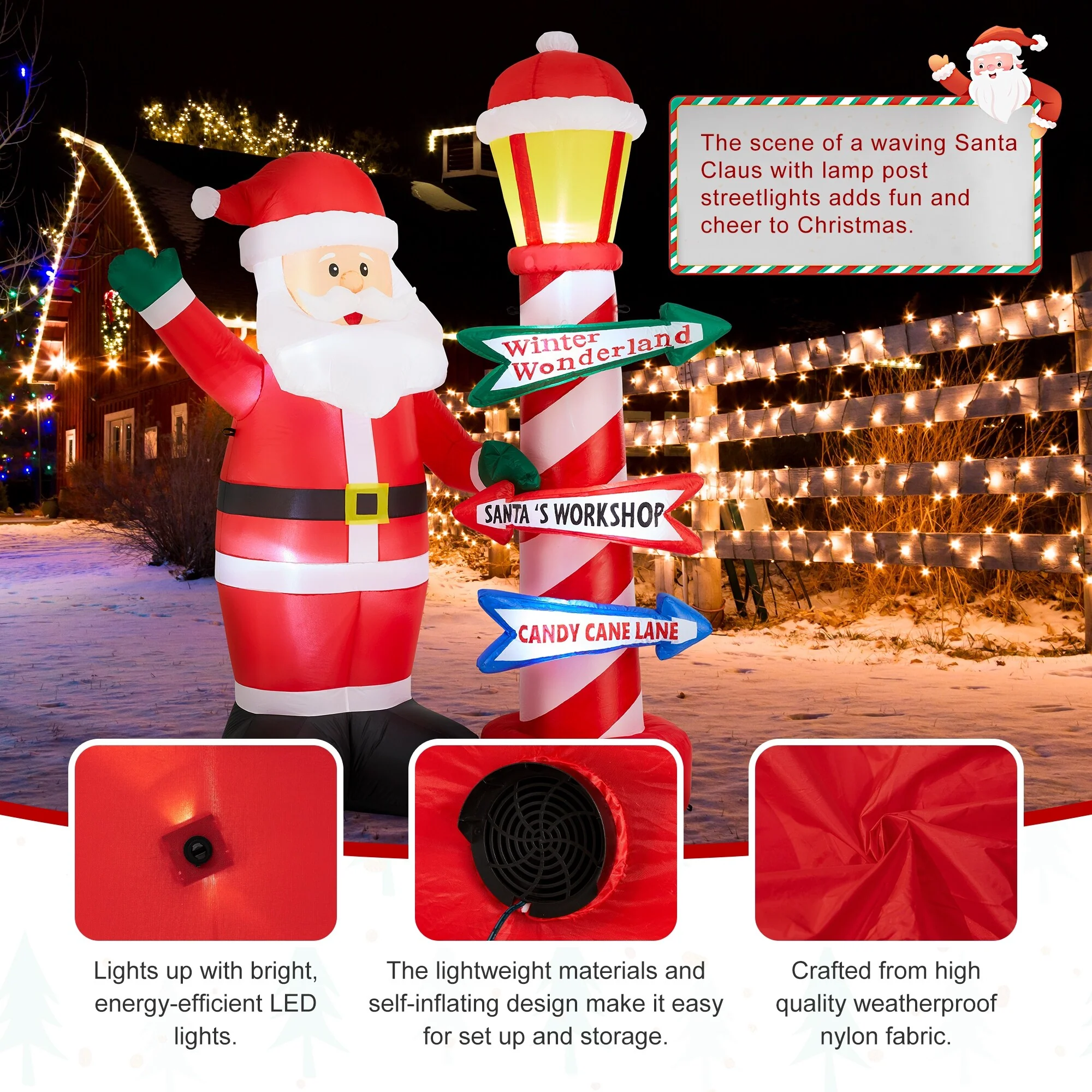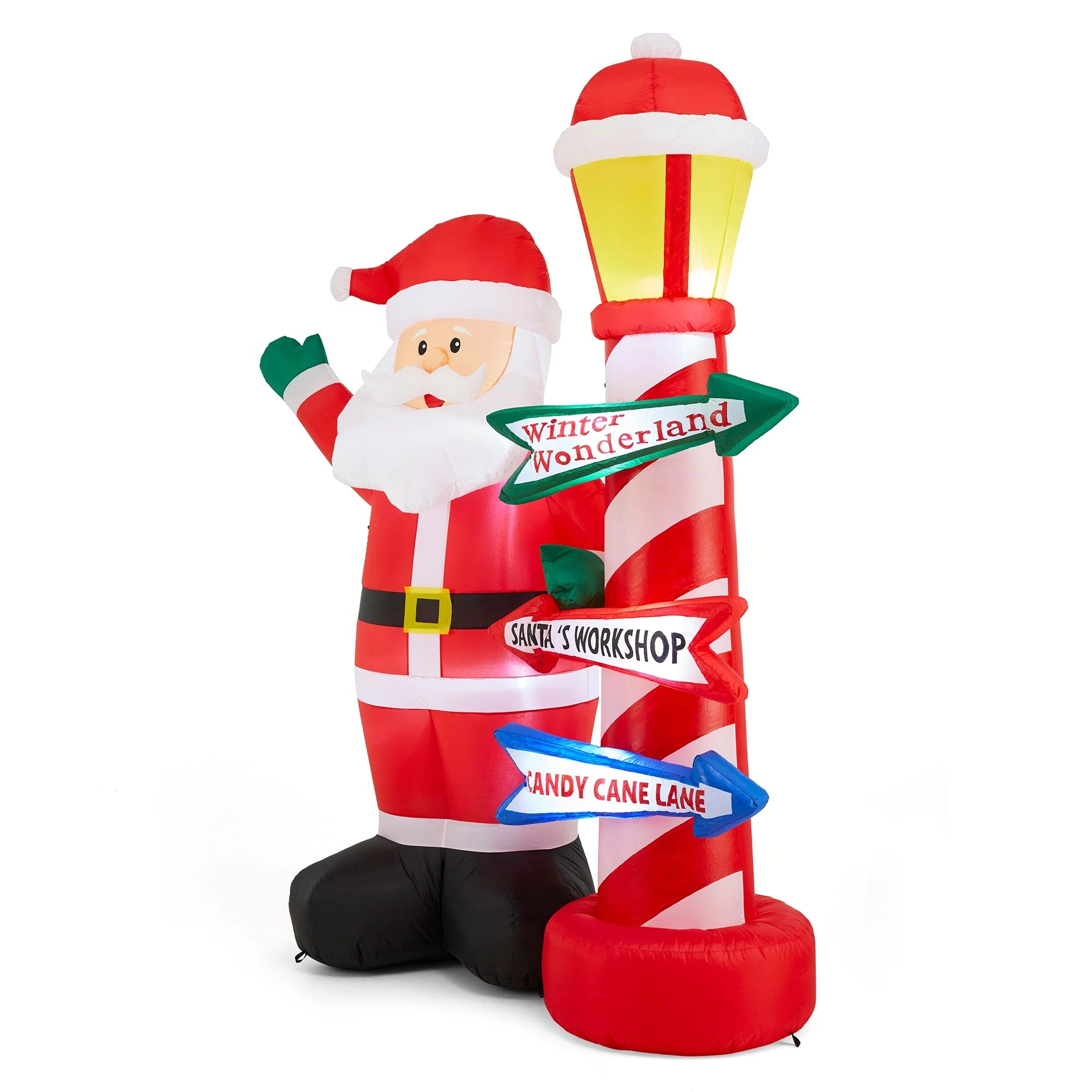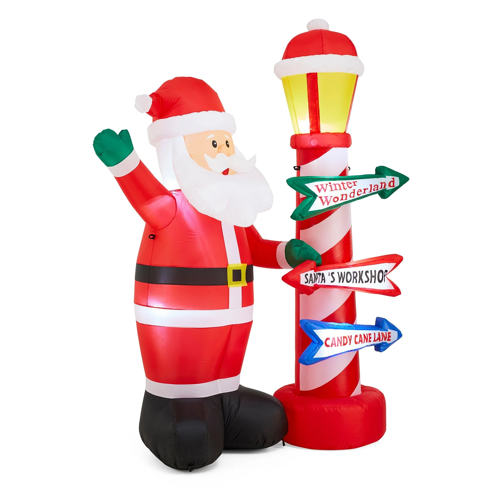 The 7FT Lighted Inflatable Decor is a vibrant and eye-catching outdoor holiday decoration, featuring a cheerful Santa Claus waving and holding a lamp post with directional signs pointing towards festive destinations like "Winter Wonderland," "Santa's Workshop," and "Candy Cane Lane," all illuminated to create a warm and inviting atmosphere.