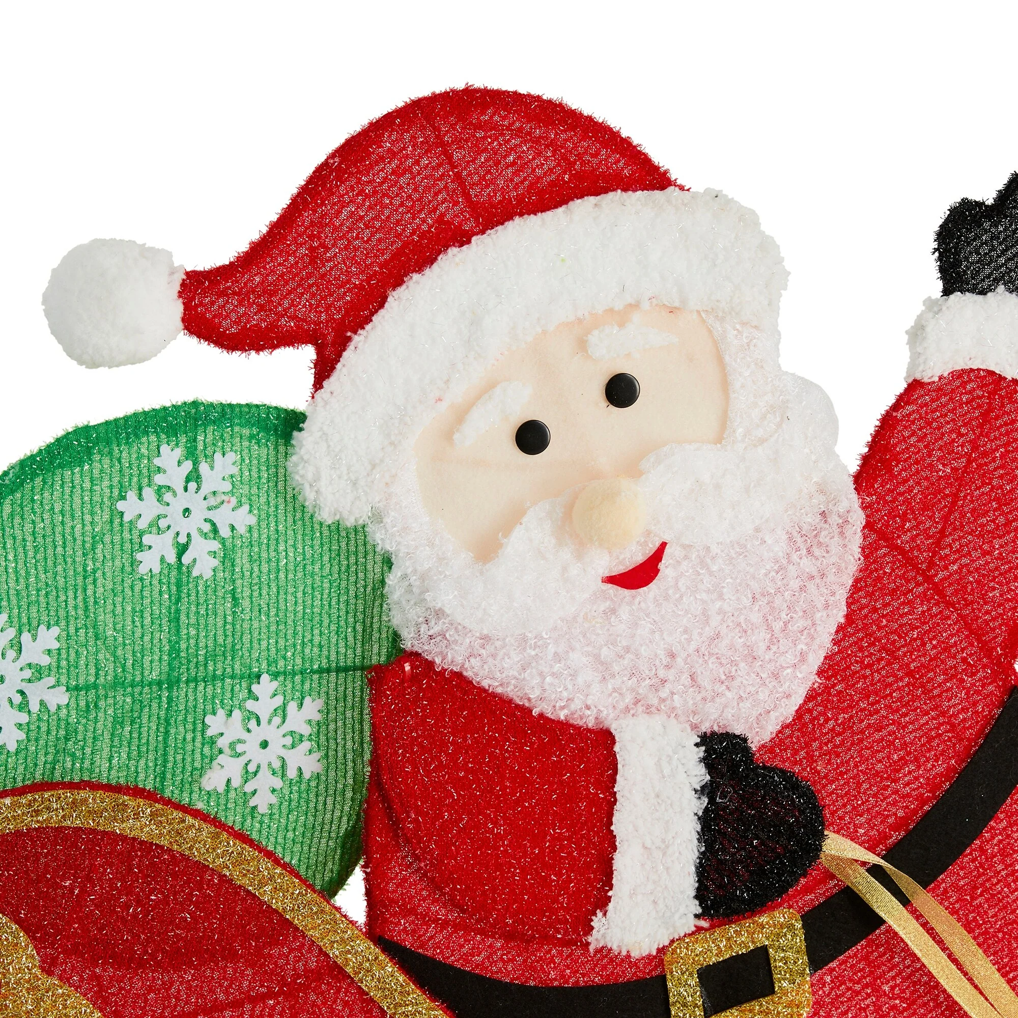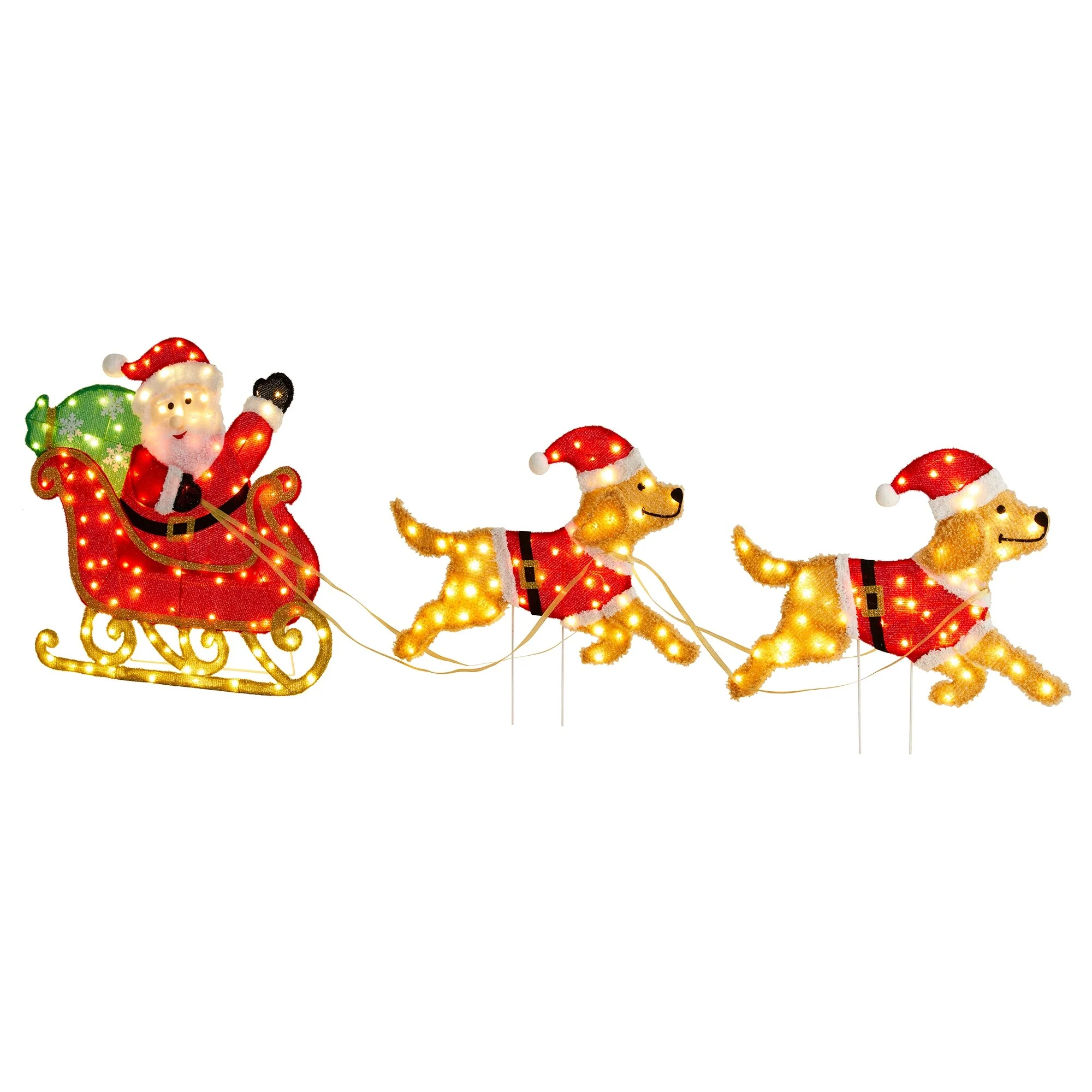 The 90.5"L Christmas 2D Fabric Lighted Outdoor Decor is a vibrant and eye-catching decoration that features Santa Claus riding a sleigh pulled by two playful, lighted-up dogs, creating a festive scene that brings holiday cheer to any outdoor setting.
