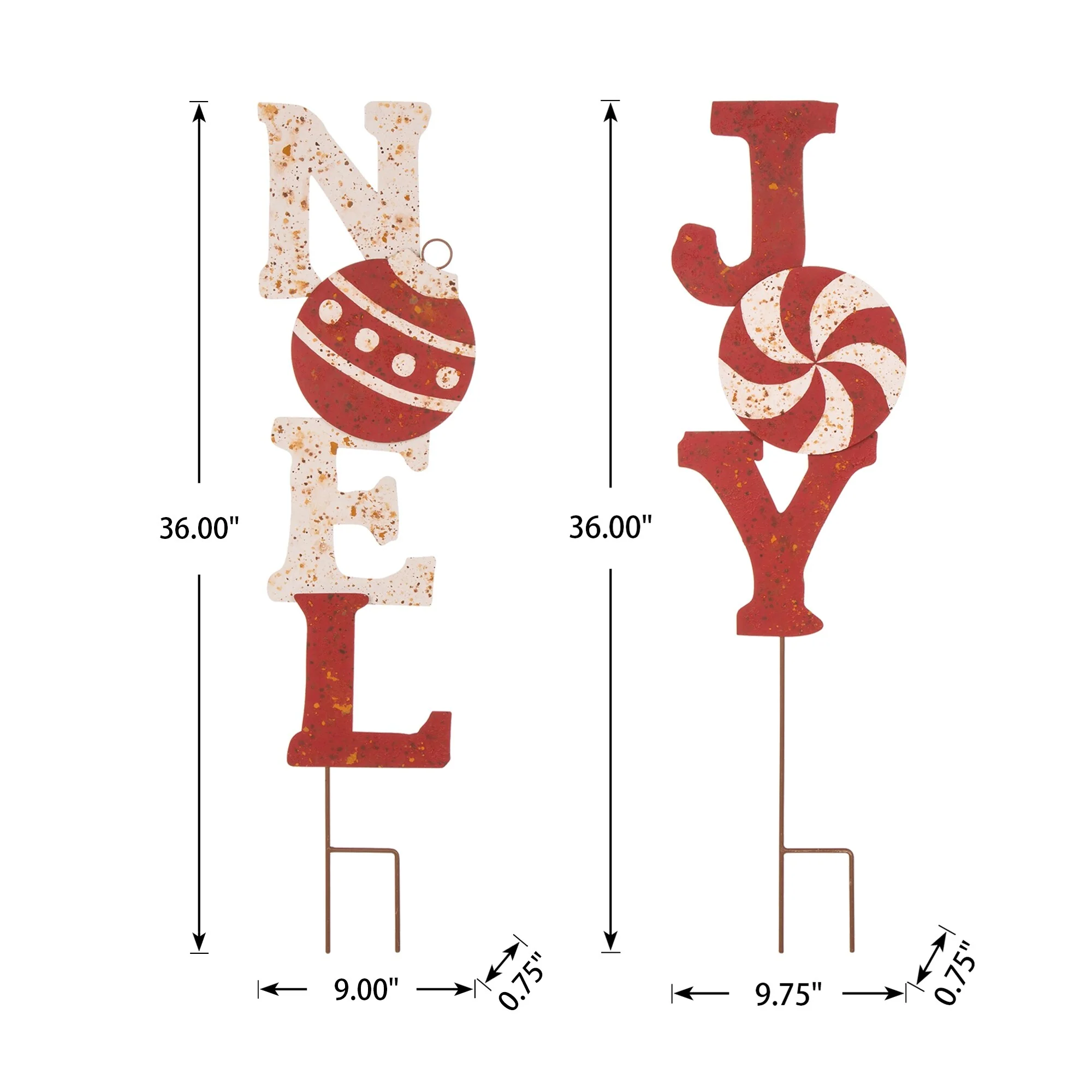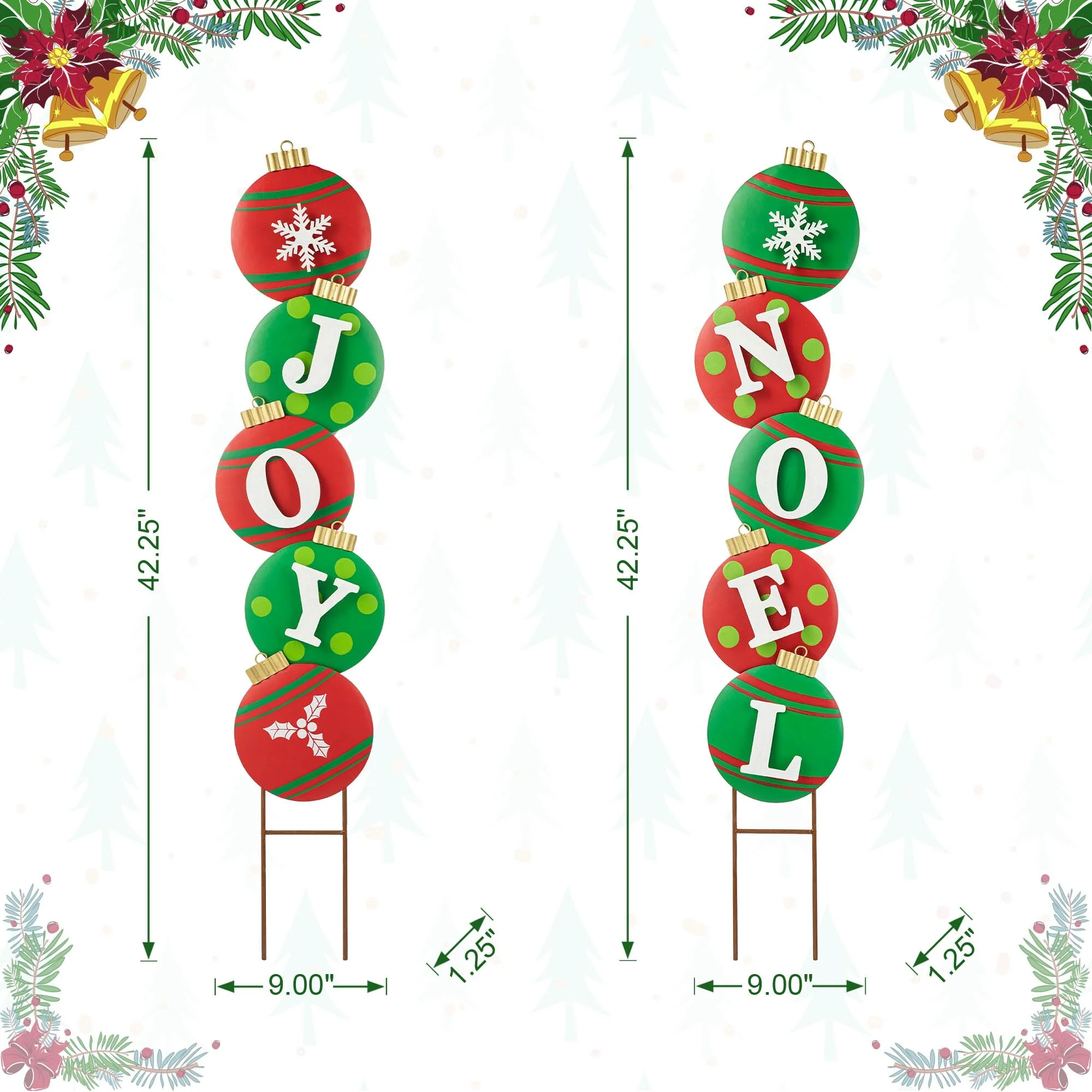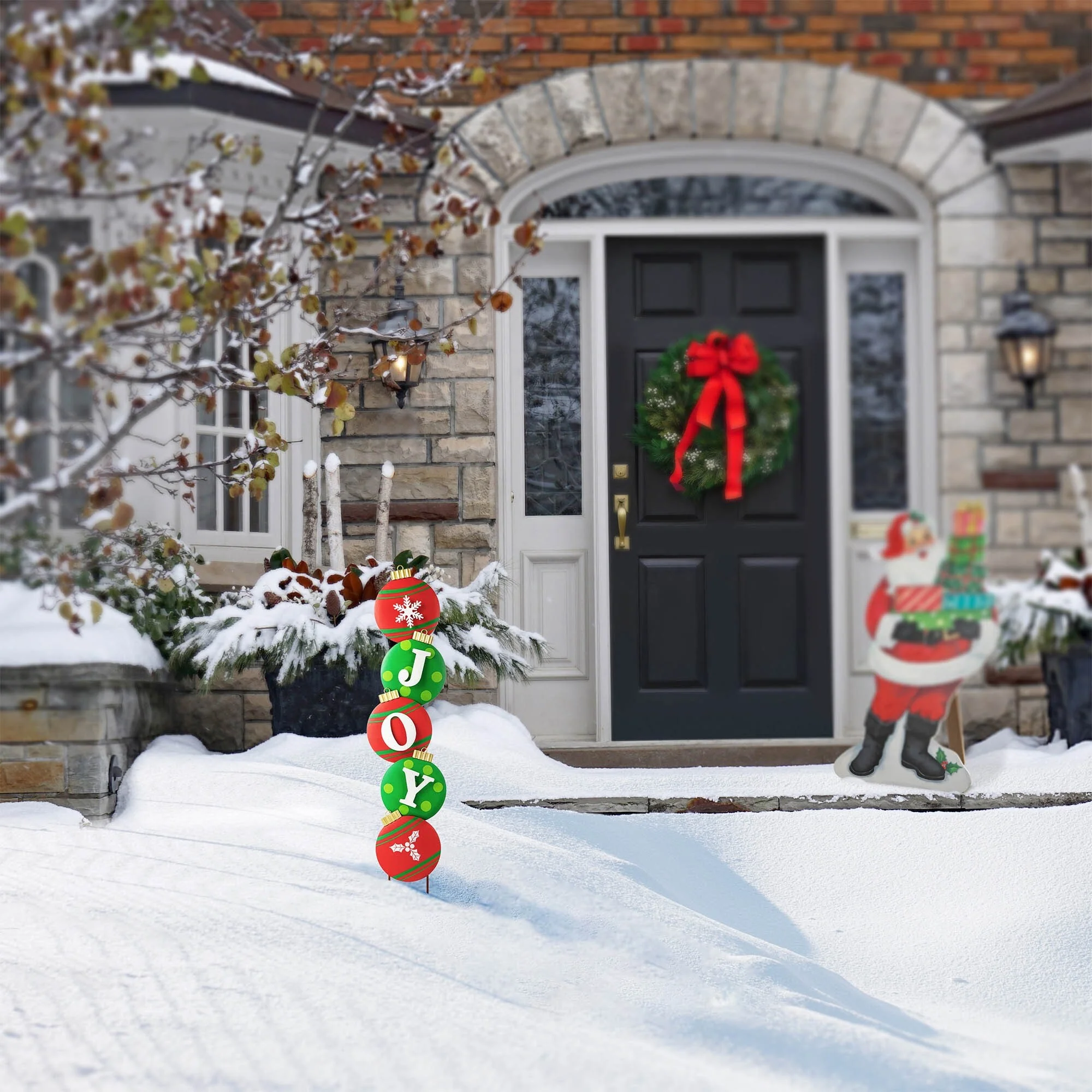 Guide your guests and proudly show off your holiday spirit with this JOY/NOEL ornament yard stake! It features dimensional white letters that say JOY/NOEL on red and green ornaments, accent with snowflakes, dots and stripes that make it unique. Comes with 10"H stake to make sure it can be securely put into ground.