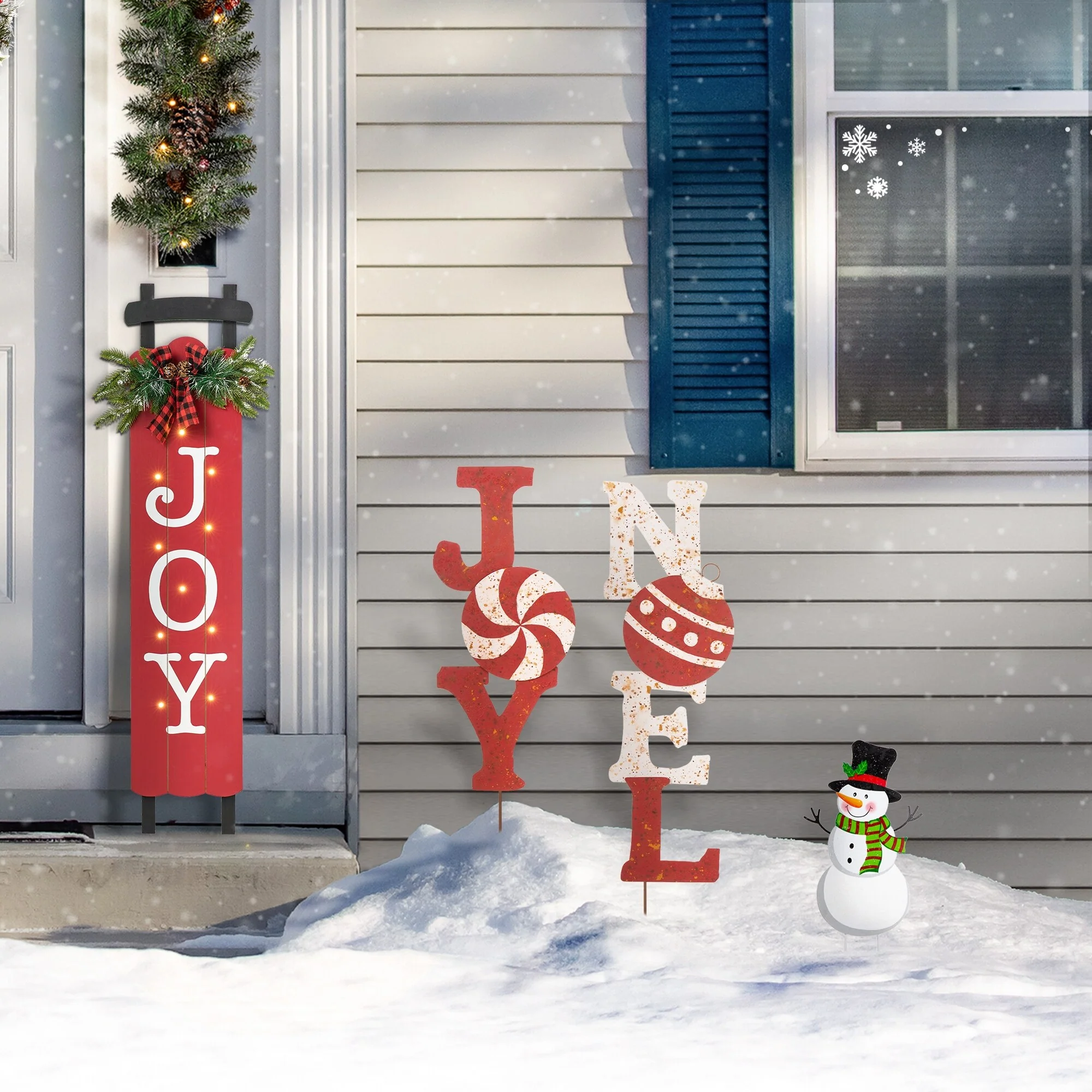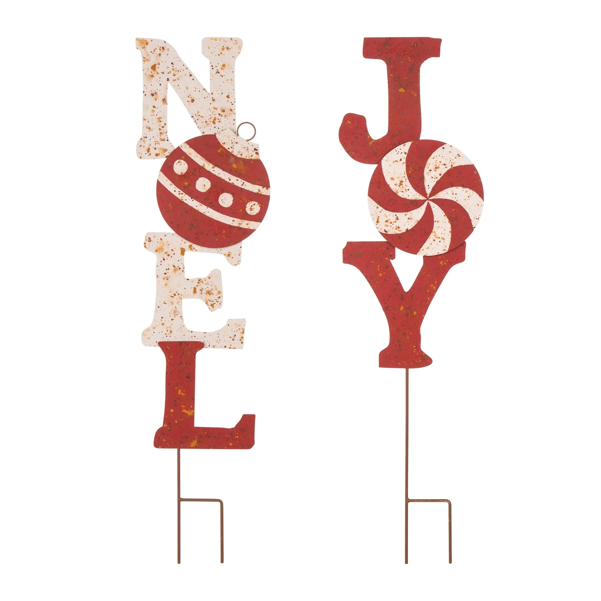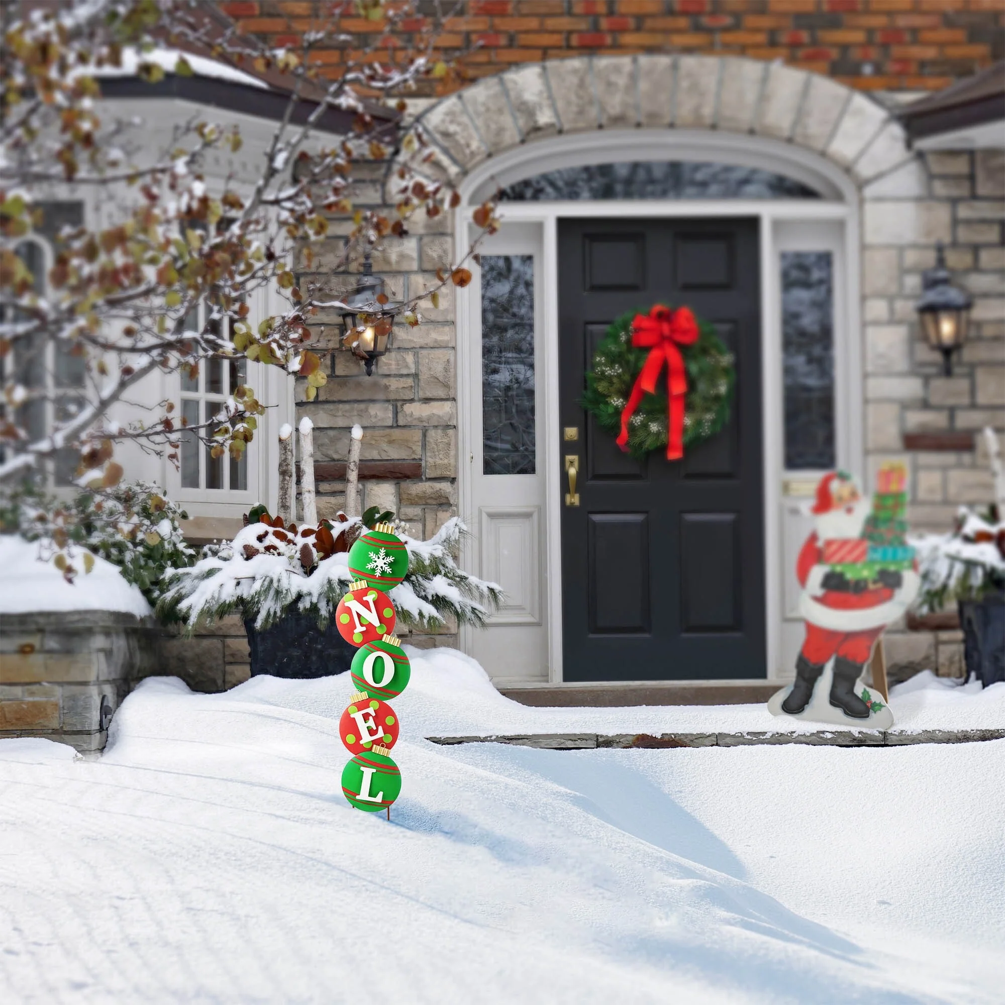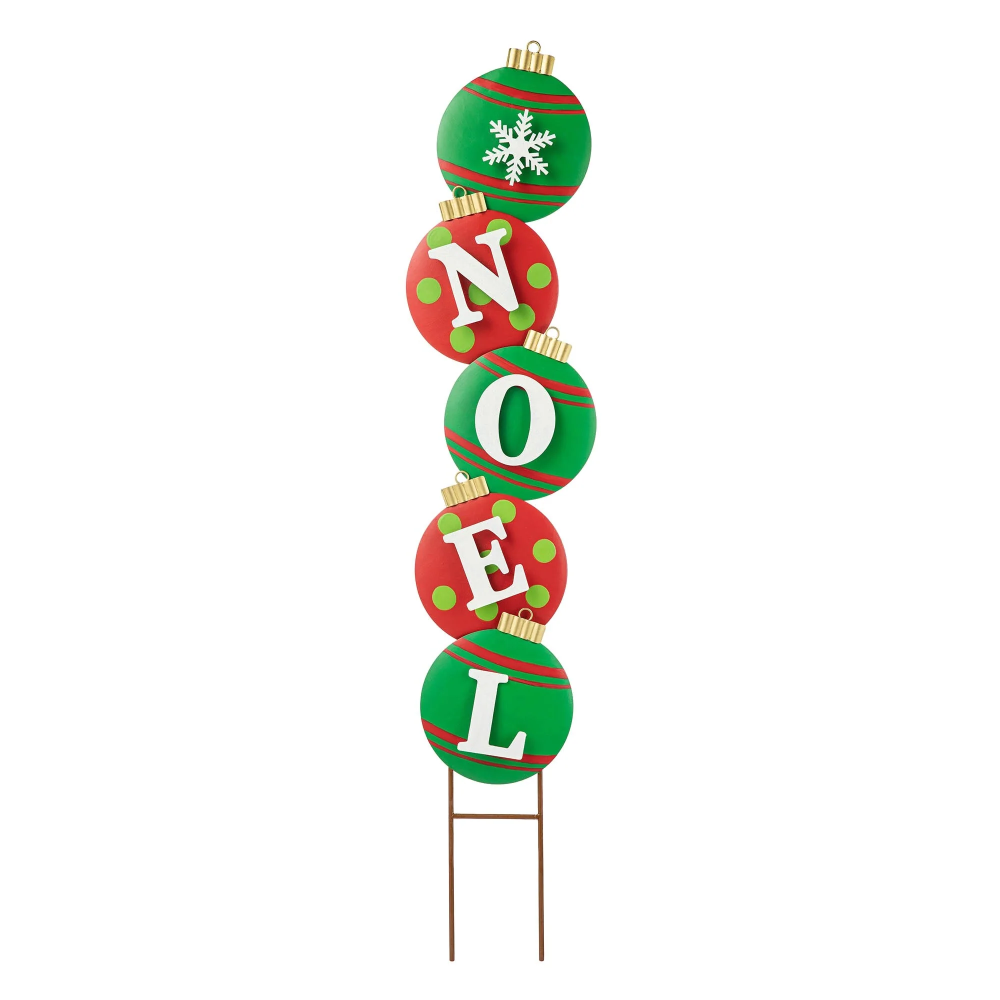 Guide your guests and proudly show off your holiday spirit with this JOY/NOEL ornament yard stake! It features dimensional white letters that say JOY/NOEL on red and green ornaments, accent with snowflakes, dots and stripes that make it unique. Comes with 10"H stake to make sure it can be securely put into ground.