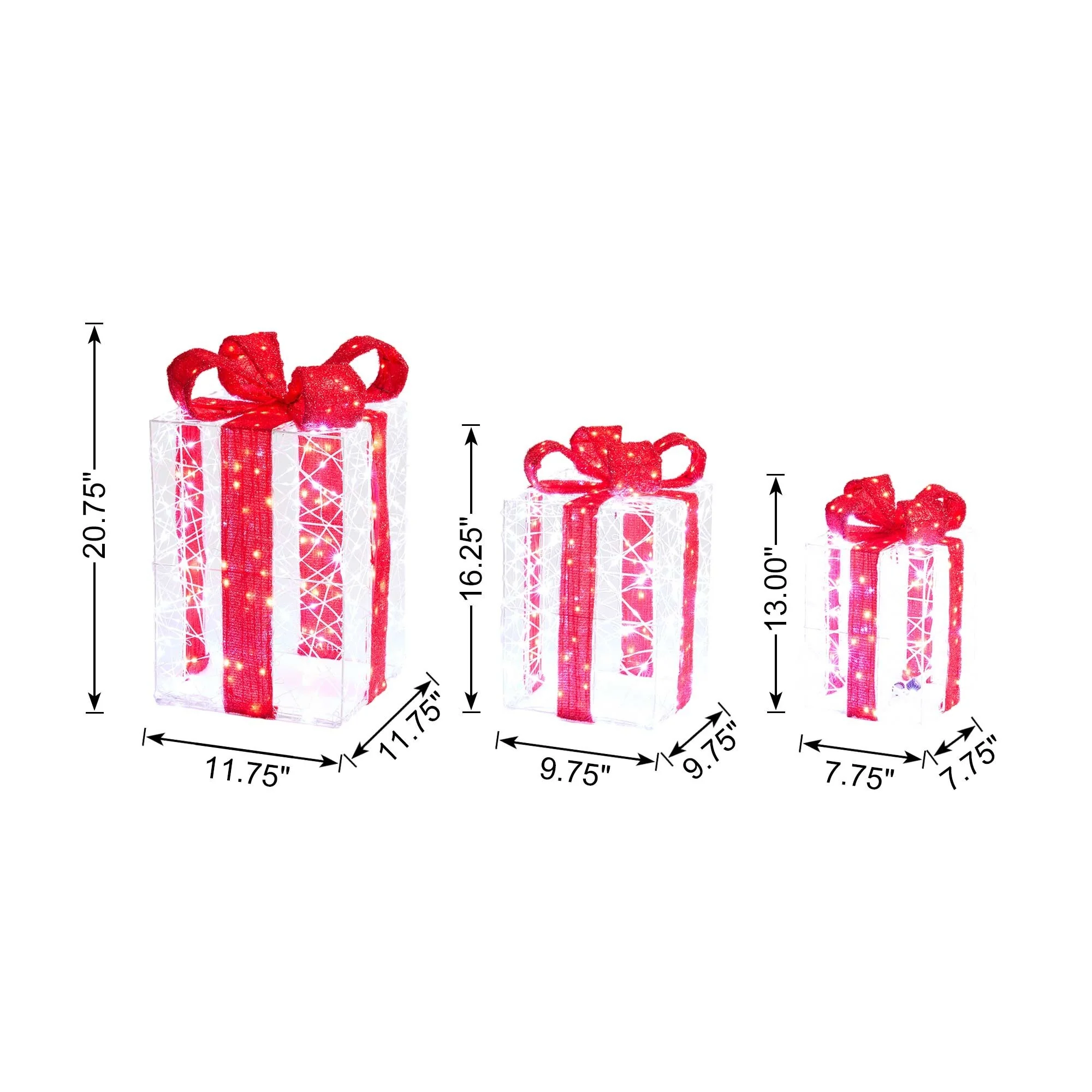 Our set of three outdoor 3D Christmas crystal gift boxes with 855 warm white lights comes in three different sizes. Each box is designed to add a touch of elegance and festivity to your outdoor holiday decorations. The varying sizes allow for a visually appealing display, creating depth and dimension in your outdoor spaces.